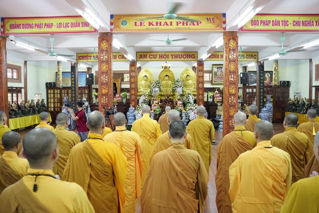 Đúng 7h30, toàn thể chư Tôn đức Tăng Ni trong hạ trường đã lễ cầu gia bị, niêm hương bạch Phật và bắt đầu nghi thức khai pháp. Tại đây, toàn thể đại chúng đối trước Pháp tòa vọng bái Đức Đệ Tam Pháp Chủ GHPGVN, ngôi đường chủ của Trường hạ, cũng là chủ pháp để cầu pháp Ngài. Sau đó đại chúng đã ra lễ Thượng tọa giảng sư để cung thỉnh Thượng tọa thùy từ hứa khả giảng pháp cho 3 tháng hạ an cư tại trường hạ Đại Từ Ân.