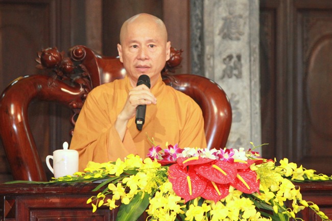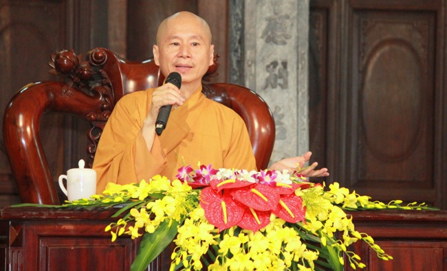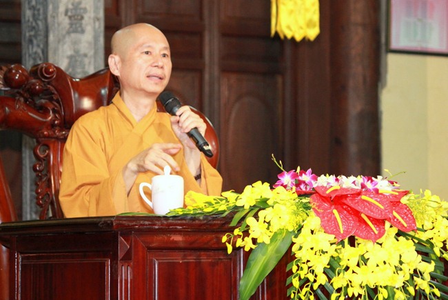 Tiếp theo, Thượng tọa nói về nguyên nhân xuất hiện tôn giáo. Cách đây hàng nghìn năm, khi xã hội chưa tiến bộ, con người sống với nhau, ứng xử nhau theo kiểu mạnh được yếu thua thì bao nhiêu cảnh tàn khốc, bao nhiêu cái ác hiện ra. Sống trong thế giới đó, con người luôn sợ hãi. Lúc này, các nhà tôn giáo xuất hiện, dựng lên cái ước mơ về một thế giới tươi đẹp hơn, không phải ở cõi này. Con người nghe vậy đã hy vọng về một thế giới khác, chính là cõi thánh, cõi trời và tôn giáo từ đó xuất hiện.