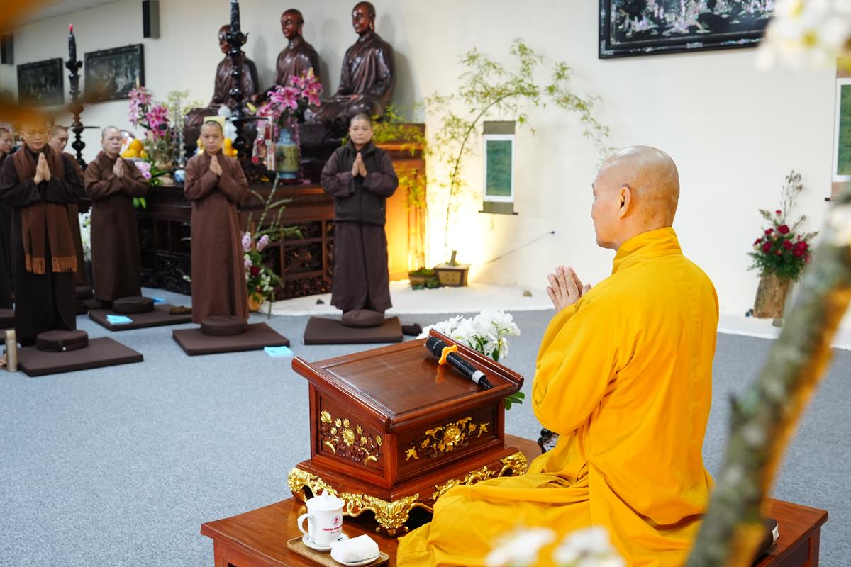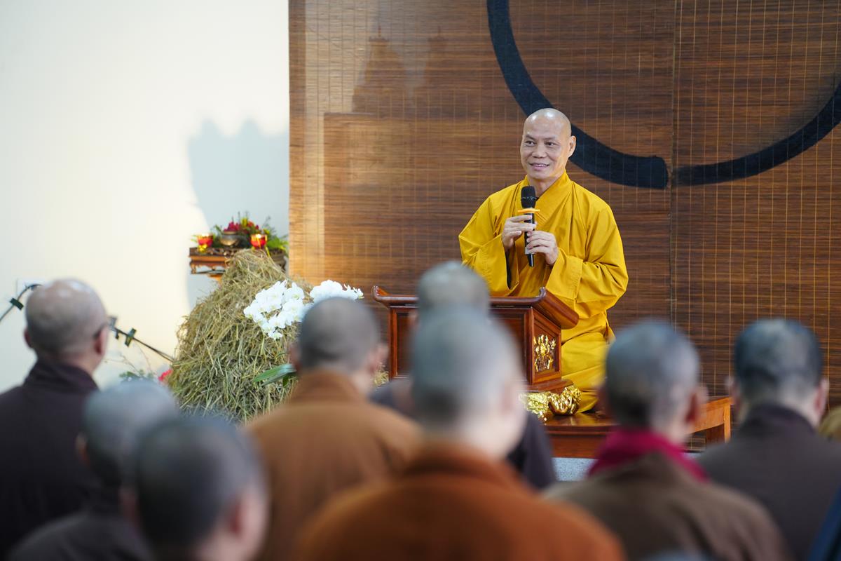 Trong bài giảng, Thượng tọa cũng đã chia sẻ với Tăng Ni về cách thức tu tập sao để mang lại lợi lạc. Trong đó bước đầu tiên là nhìn lại chính mình, tu tập với chính mình. Tu tập trong công phu hành trì lễ bái, thời khóa nhưng phải thấm trong tâm bồ đề của mình. Từ đây tỏa ra lời nói, hành động, tư duy giúp cho tâm trong vắt sáng ngời. Cho nên người tu luôn phải học giới luật, oai nghi vì “Trú chỉ oai nghi, tiện thị tăng trung pháp khí”. Thượng Tọa nhấn mạnh: “Oai nghi chính là pháp khí Đại thừa. Oai nghi phải toát ra được dù ánh mắt, nụ cười, quét sân, rửa bát đều là giáo pháp. Oai nghi rất quan trọng”.