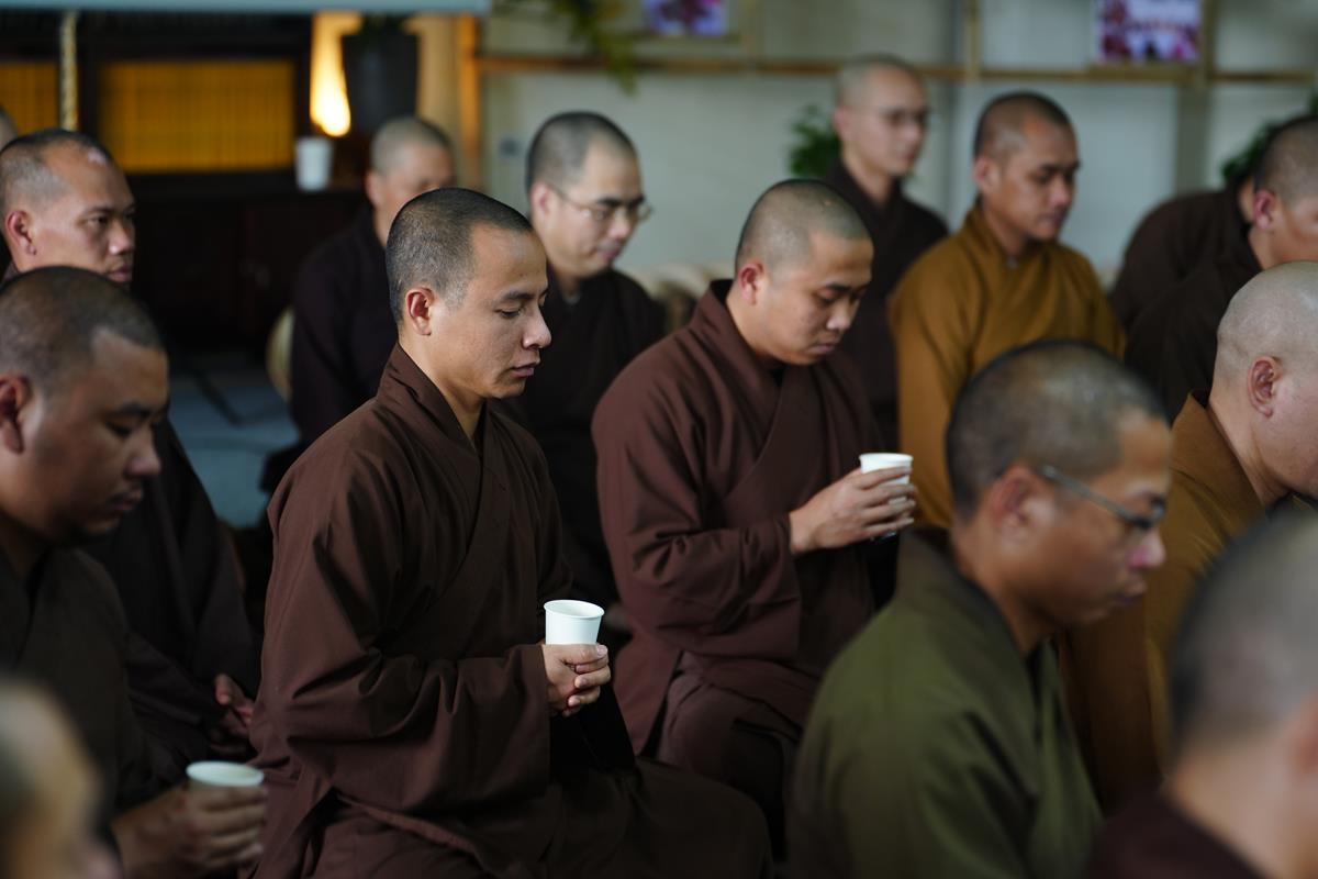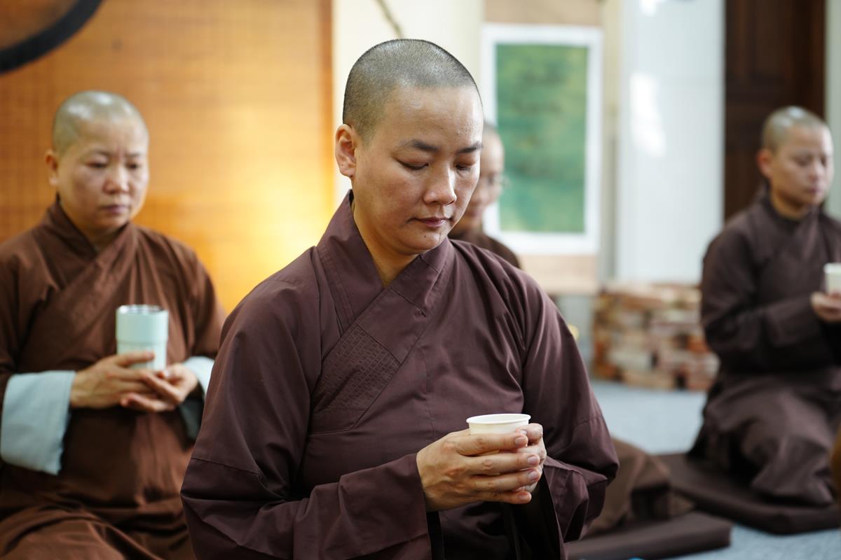 Đầu giờ chiều là chương trình Thiền trà khép lại khóa tu diễn ra đầy xúc động, dưới sự chứng minh của Thượng tọa Thích Chiếu Tuệ – Ủy viên HĐTS, Phó trưởng Ban thường trực Ban Hoằng pháp TW, Trụ trì chùa Vạn Phúc và chư Tôn đức điều hành lớp Đào tạo Cao cấp Giảng sư. Trong không gian tĩnh lặng nơi chốn già lam Vạn Phúc, chư Tăng Ni cùng ngồi lại bên nhau, chia sẻ những cảm xúc và những giá trị đã học được trong những ngày diễn ra khóa tu. Đặc biệt, cùng ngồi xem lại những khoảnh khắc của 2/3 chặng đường học tại lớp Đào tạo cao cấp Giảng sư khóa II.