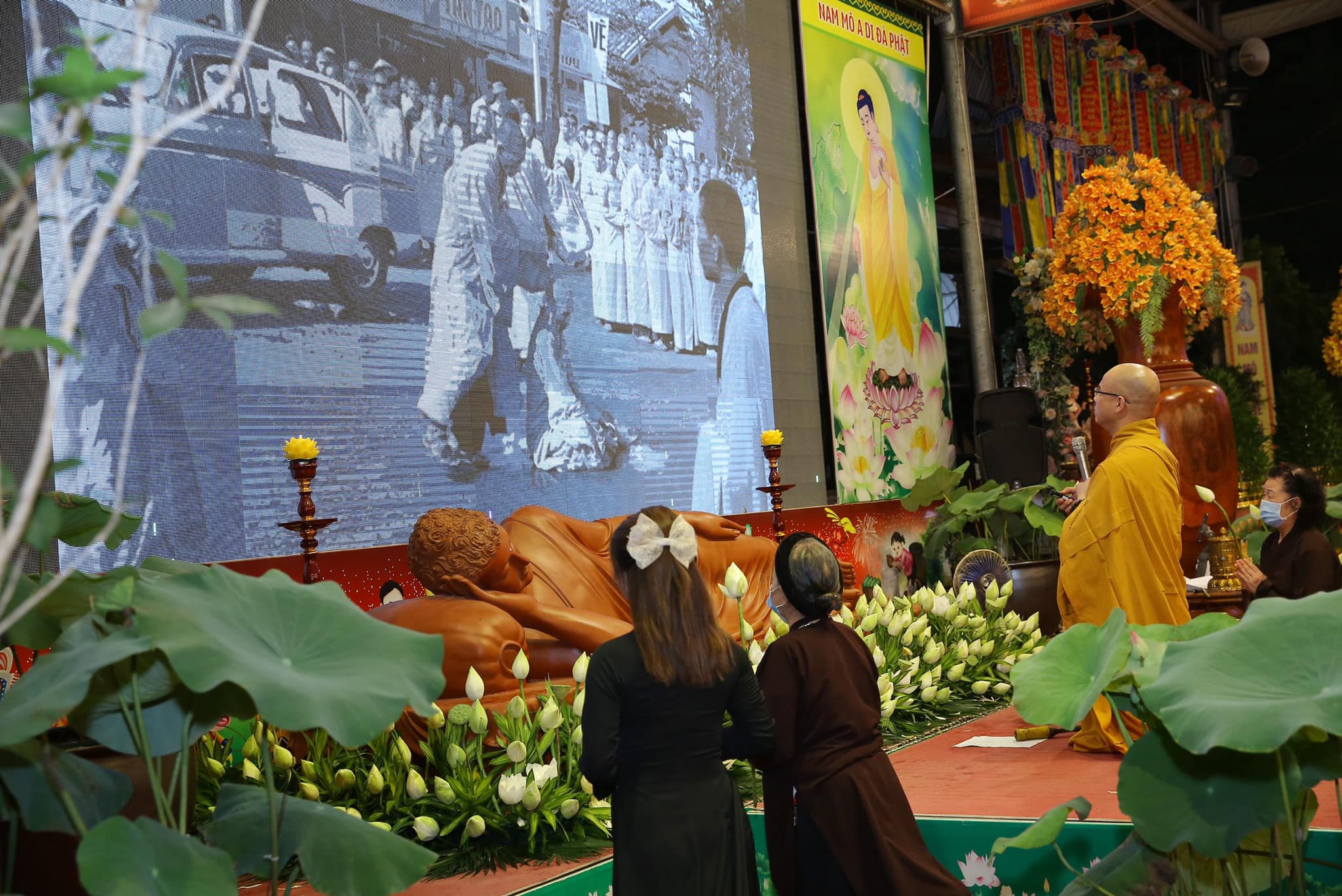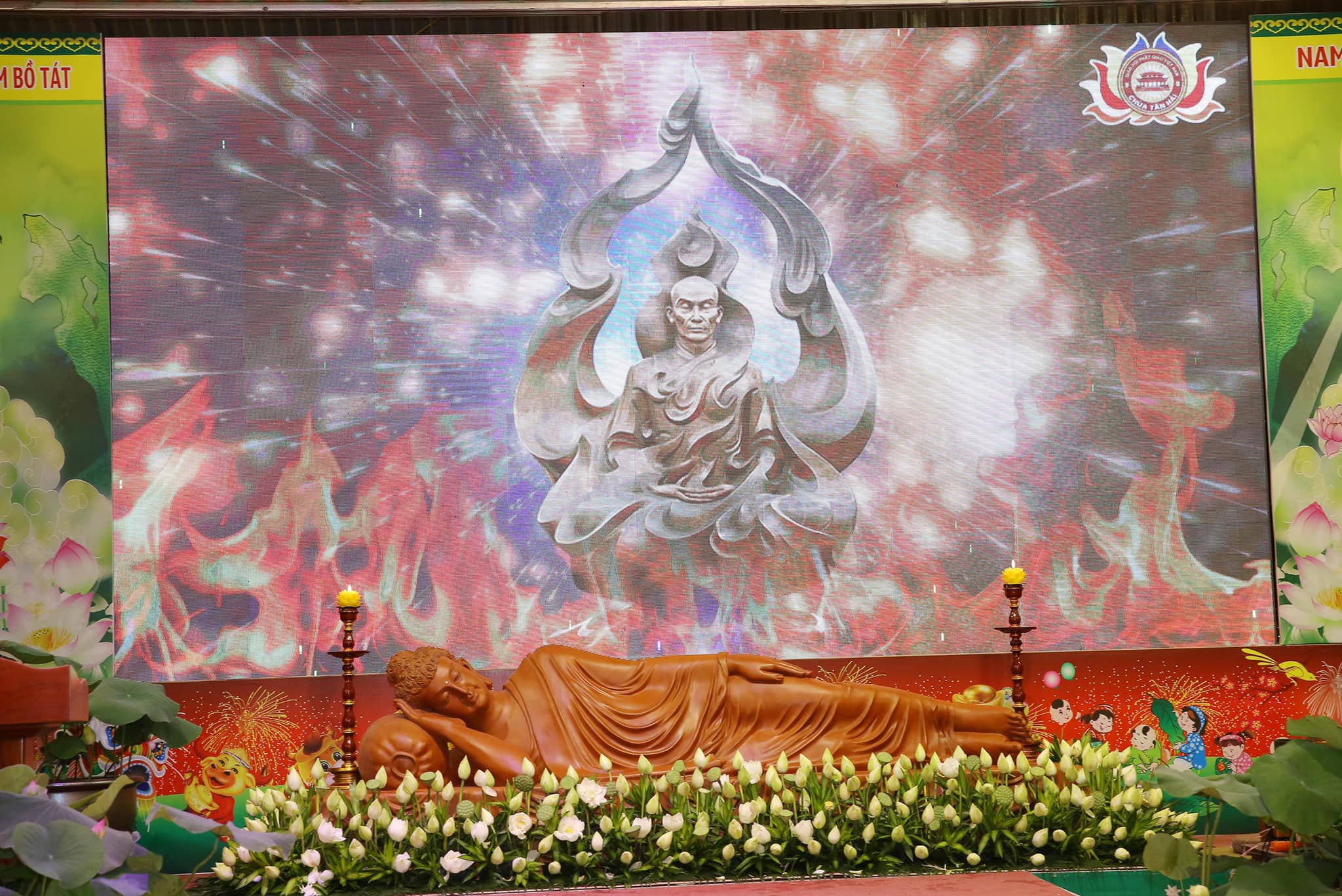 Tôn tượng Bồ Tát Thích Quảng Đức được trình chiếu trên màn hình lớn chùa Tân Hải.