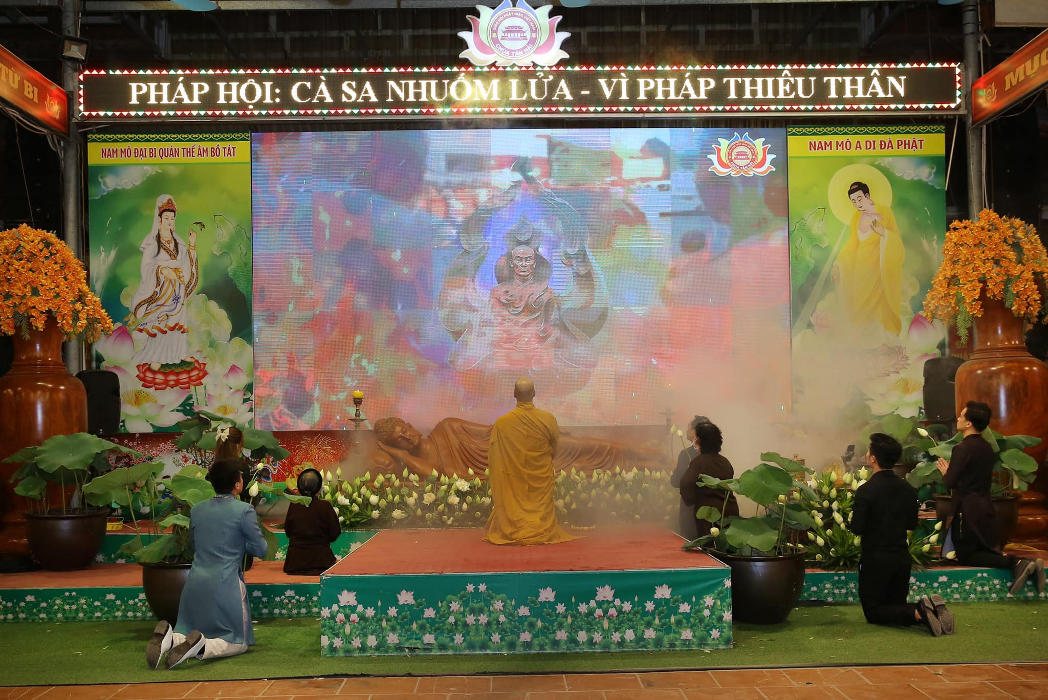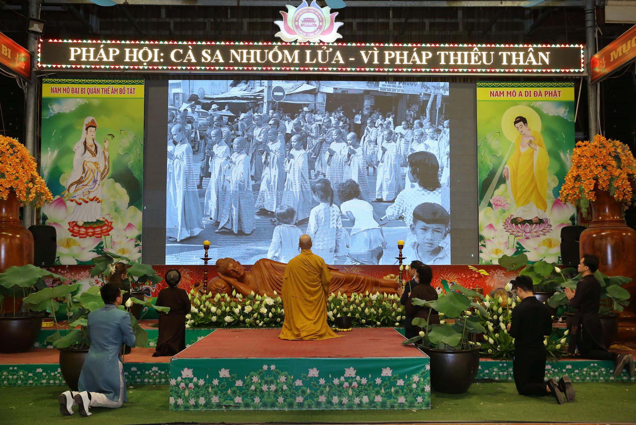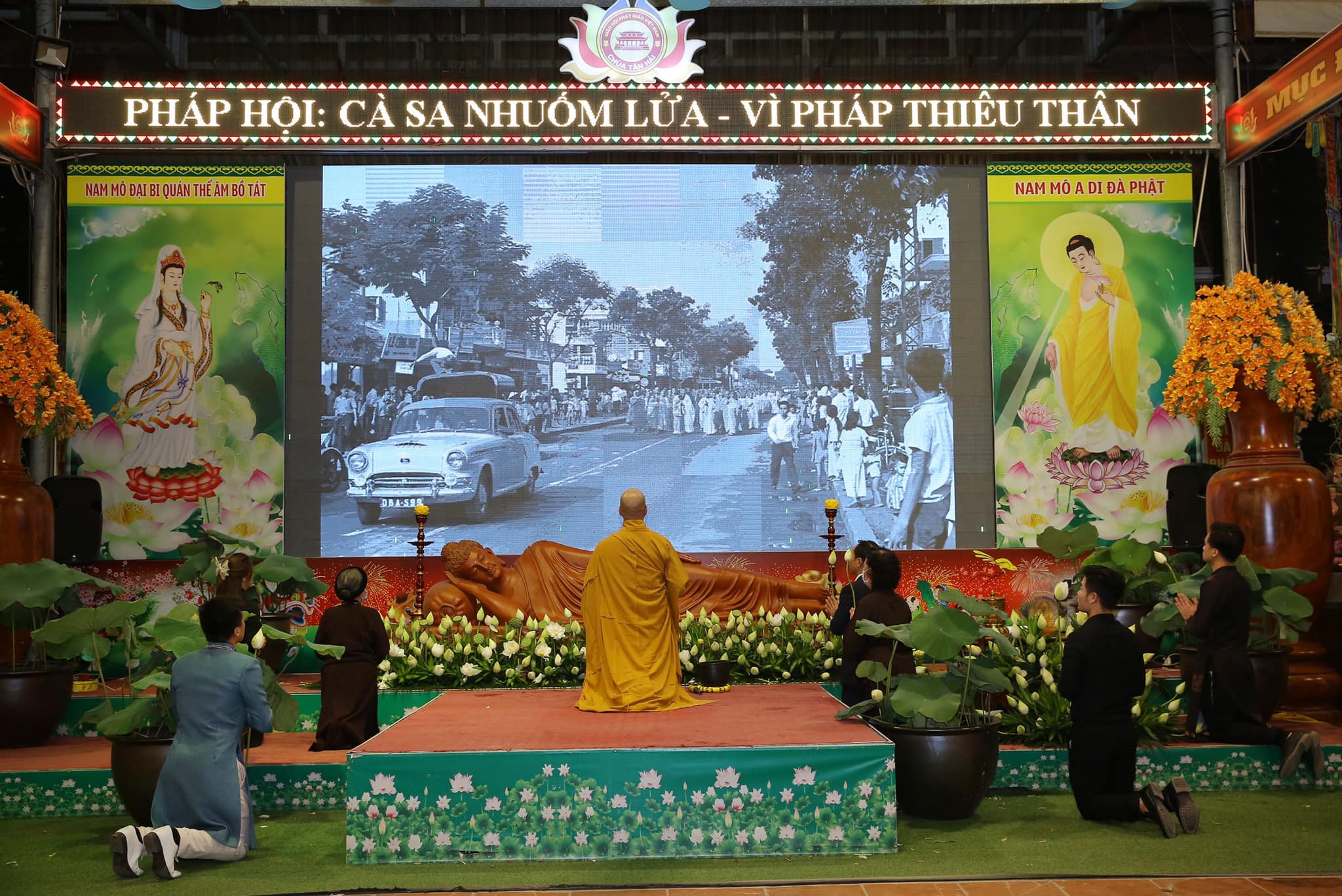 Toàn bộ sự kiện Bồ Tát Thích Quảng Đức tự thiêu ngày 11/06/1963 đã được Ban thông tin truyền thông chùa Tân Hải tái hiện lại trên màn hình led lớn trước chính điện để toàn thể đại chúng đang theo dõi trực tuyến buổi lễ cùng chứng kiến giây phút đầy xúc động này.