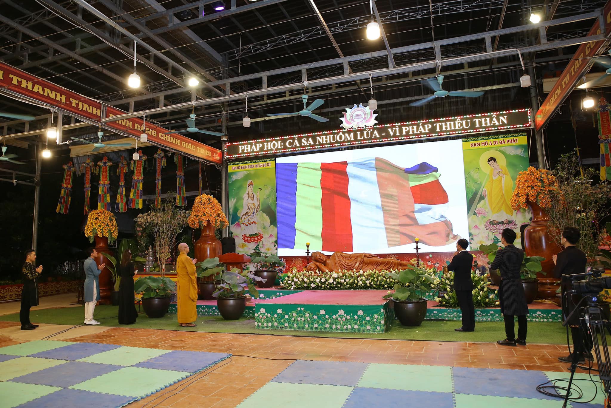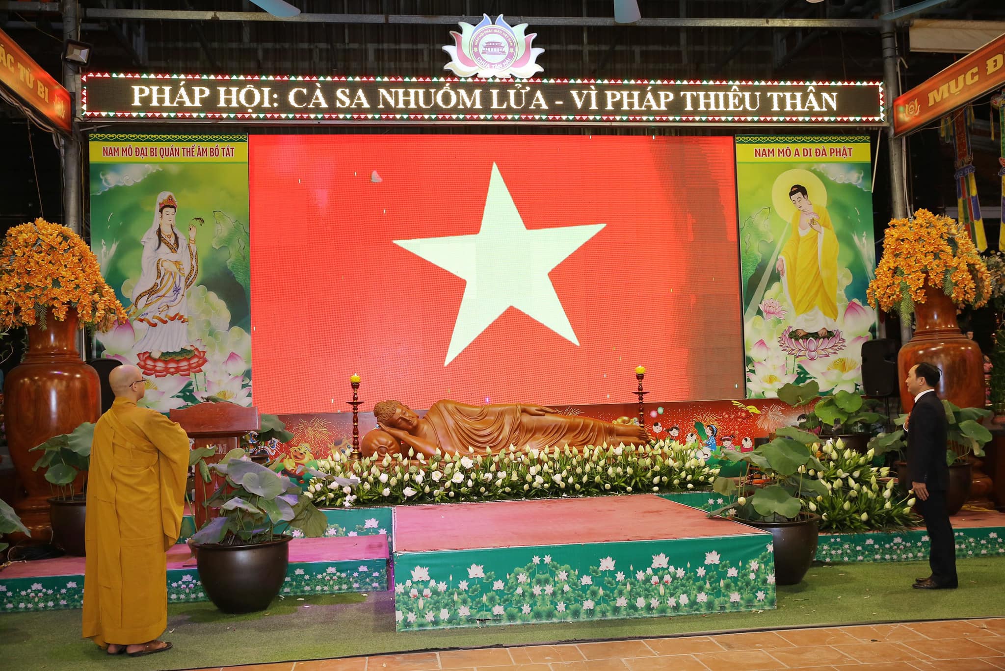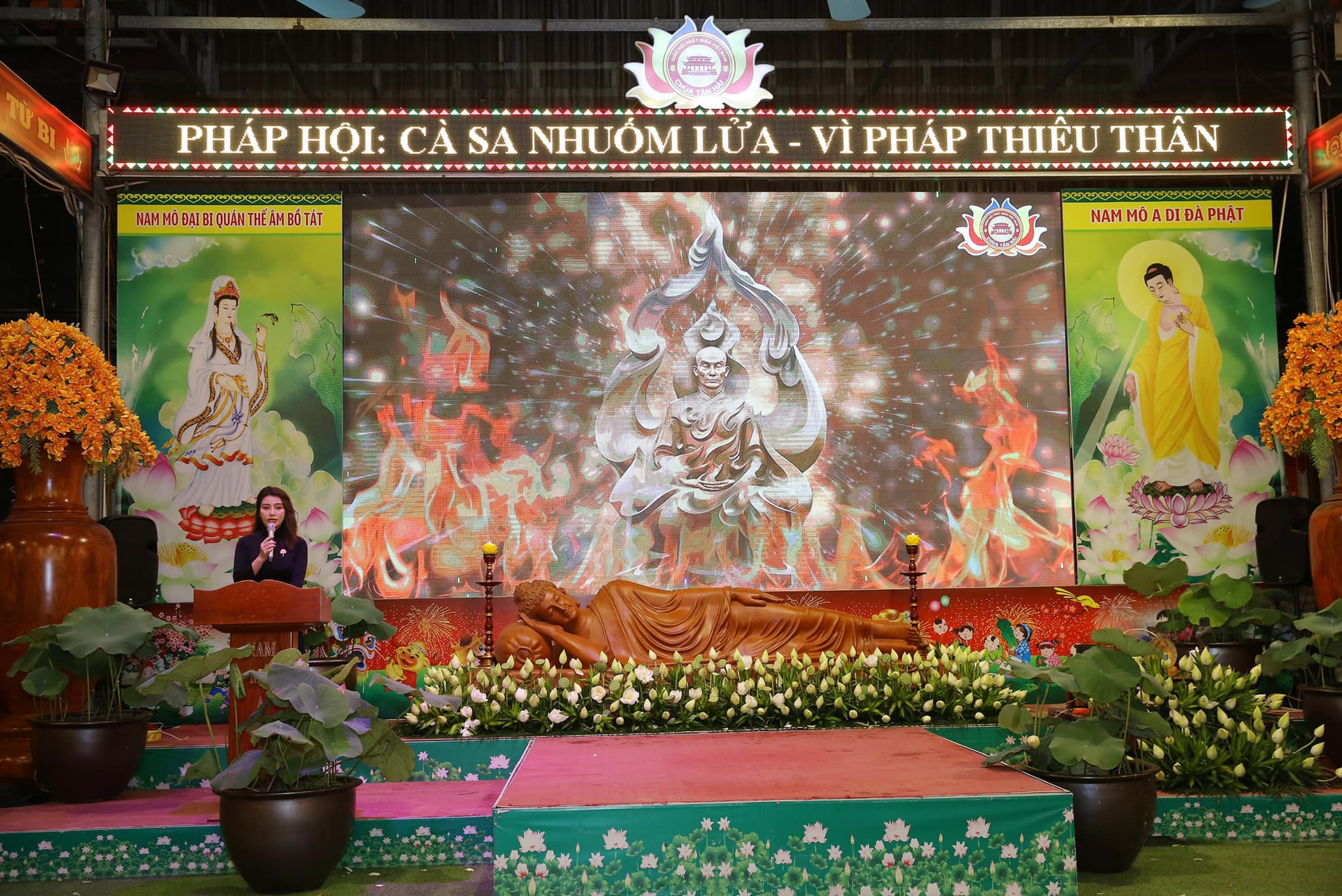 Toàn bộ sự kiện Bồ Tát Thích Quảng Đức tự thiêu ngày 11/06/1963 đã được Ban thông tin truyền thông chùa Tân Hải tái hiện lại trên màn hình led lớn trước chính điện để toàn thể đại chúng đang theo dõi trực tuyến buổi lễ cùng chứng kiến giây phút đầy xúc động này.