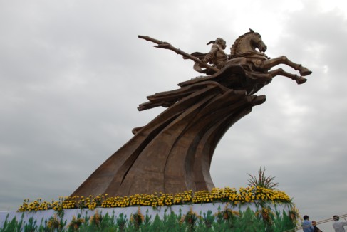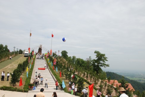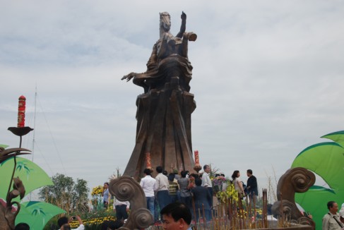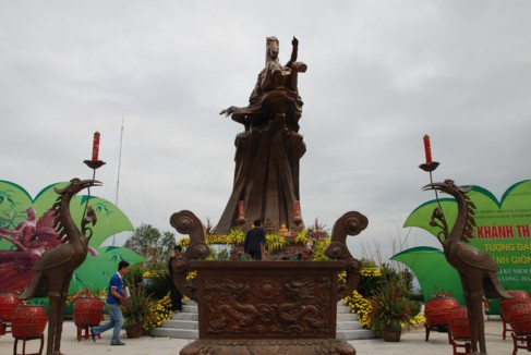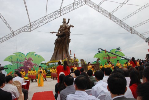 Tượng đài Thánh Gióng được đúc hoàn toàn bằng đồng, có tổng trọng lượng là 85 tấn, cao 11,2m, với tổng vốn đầu tư toàn bộ hạng mục là 60 tỷ đồng, huy động bằng sự đóng góp của các tăng ni, Phật tử, các nhà hảo tâm và toàn xã hội. Trong đó, bà Nguyễn Thị Kim Thoa – Chủ tịch HĐQT kiêm Tổng giám đốc Công ty ATS đã hảo tâm cung tiến xây dựng toàn bộ phần chính của tượng đài.