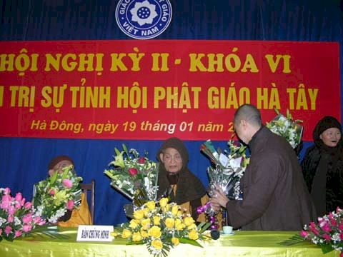 ĐĐ Thích Tiến Đạt – Phó ban Trị sự kiêm chánh thư ký Tỉnh hội Phật giáo Hà Tây đọc danh sách nhân sự BTS Phật giáo Hà Tây nhiệm kỳ VI, suy cử HT. Thích Thanh Bính làm Trưởng ban.