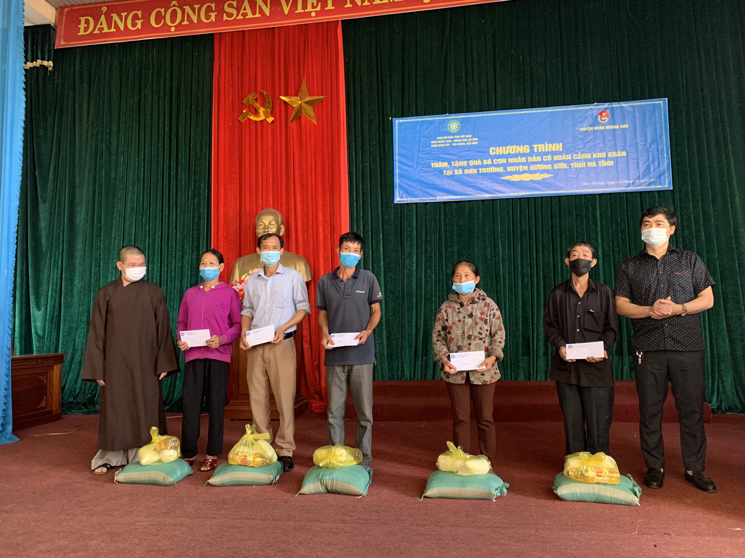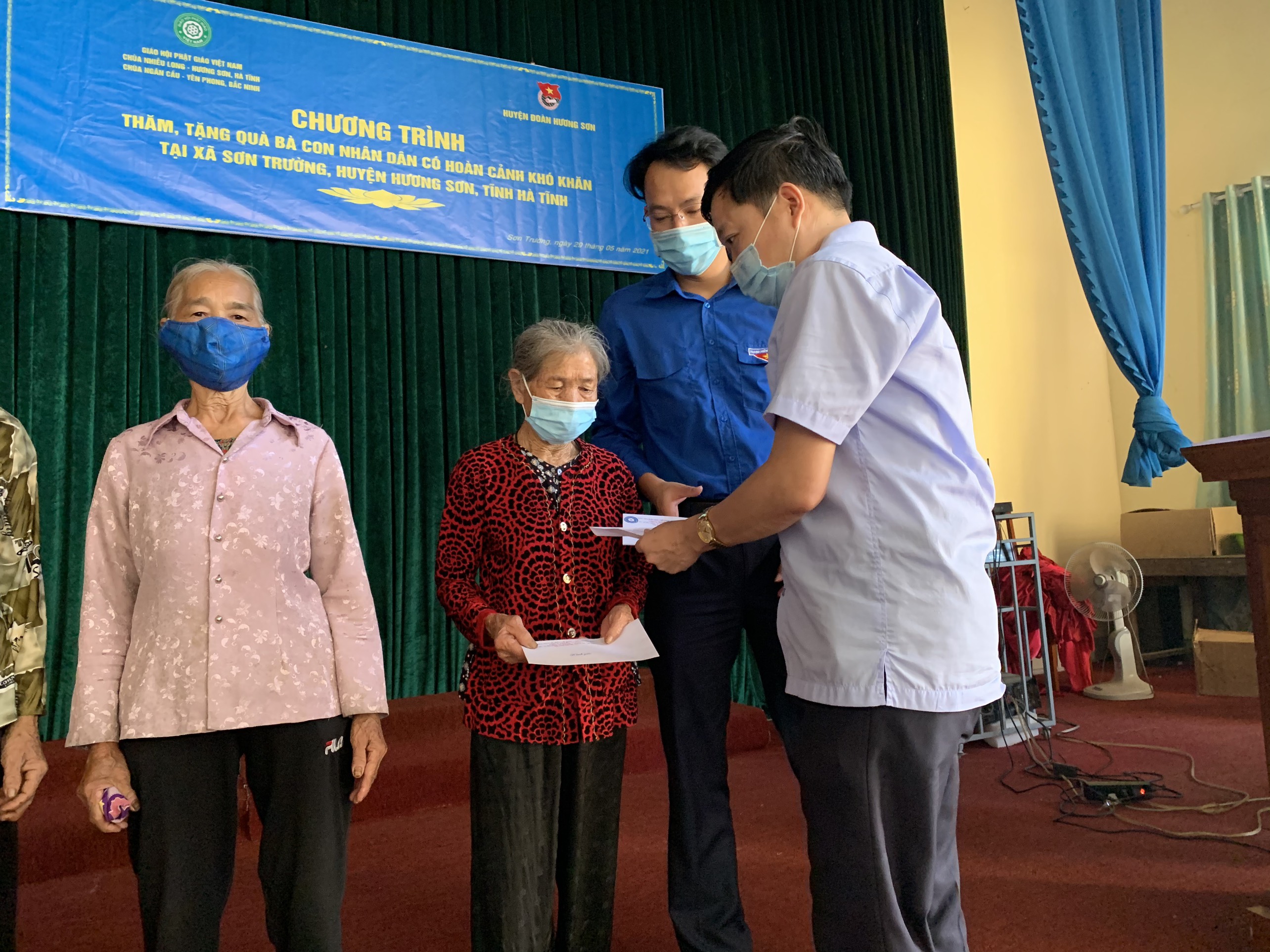 Tham gia buổi phát quà có sự hiện diện của Đại đức Thích Tâm Phương – Trưởng Ban trị sự GHPGVN huyện Hương Sơn, trụ trì chùa Nhiễu Long, thị trấn Phố Châu, huyện Hương Sơn, tỉnh Hà Tĩnh, cùng các ông bà đại diện cho các cấp Ủy Đảng thuộc HĐND, UBND, UB MTTQVN, Ban Dân vận huyện ủy huyện Hương Sơn, xã Sơn Trường, đại diện huyện đoàn huyện Hương Sơn, cùng các hộ gia đình có hoàn cảnh khó khăn, các đối tượng chính sách đang sinh sống tại địa phương.