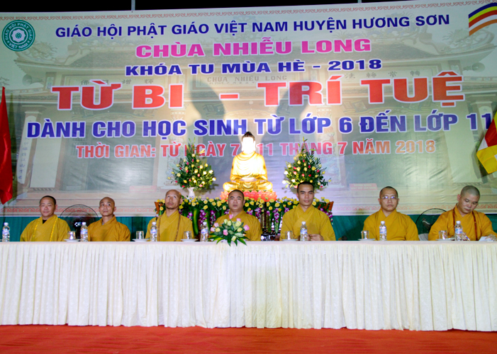 Về chứng minh cho Lễ khai mạc khóa Tu mùa hè năm 2018 tại Chùa Nhiễu Long có: – Đại đức Thích Viên Như – Ủy viên Hội Đồng Trị sự GHPGVN, Phó Trưởng Ban kiêm Chánh Thư ký GHPGVN tỉnh Hà Tĩnh. Đại đức Thích Chánh Thành – UVTT – Trưởng ban văn hóa GHPGVN tỉnh. Đại đức Thích Tâm Phương – UVTT – Trưởng ban Nghi Lễ GHPGVN tỉnh Hà Tĩnh. Trưởng ban trị sự GHPGVN huyện Hương Sơn – Trưởng ban tổ chức Khóa Tu mùa hè 2018 tại huyện Hương Sơn. Đại đức Thích Tâm Quang – UVTT – Trưởng ban Hướng dẫn Phật tử GHPG tỉnh Hà Tĩnh. Đại đức Thích Thiện Nhơn – UV BTS PG tỉnh – Trưởng ban trị sự GHPG huyện Thạch Hà. Đại đức Thích Tánh Đại – UV BTS PG tỉnh – Trưởng ban trị sự GHPG huyện Vũ Quang. Đại đức Thích Đồng Từ – UV BTS PG tỉnh Hà Tĩnh – Phó Trưởng BTS PG huyện Lộc Hà. Cùng chư tôn đức Tăng – Ni trong BTS GHPG tỉnh Hà Tĩnh và các BTSPG các huyện thị trong tỉnh, chư Đại đức Tăng Ni trong Hạ trường Phật giáo trong tỉnh cũng về tham dự.