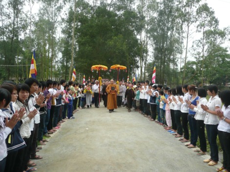 Các em học sinh cung nghênh chư Tôn đức quang lâm