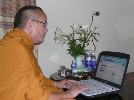 Trước giờ khai mạc, Thượng tọa Thích Bửu Chánh xem giao diện mới của Phattuvietnam.net