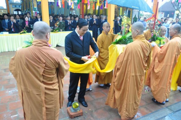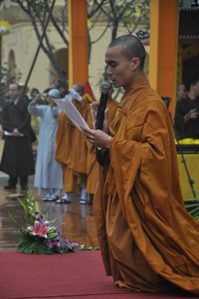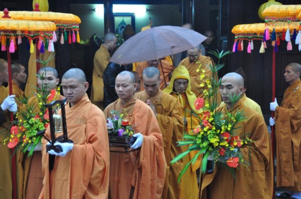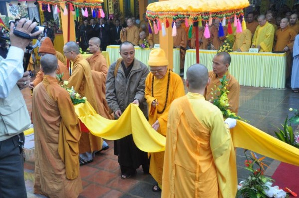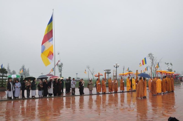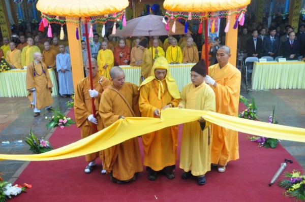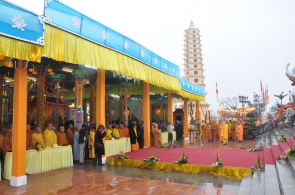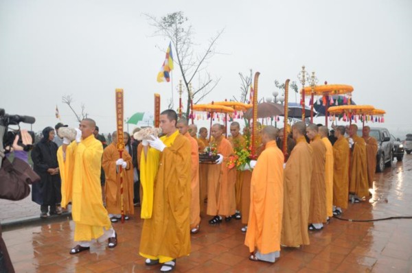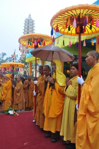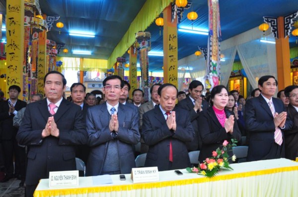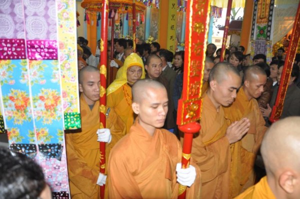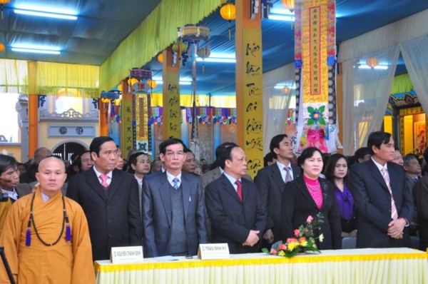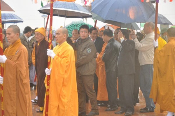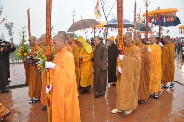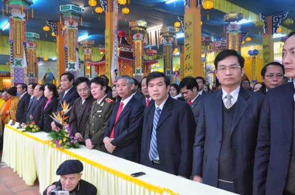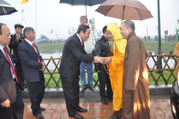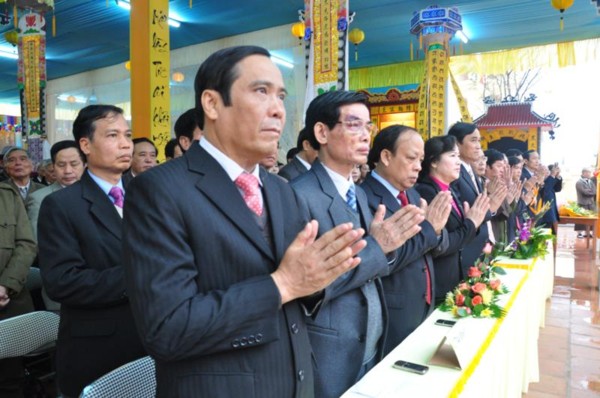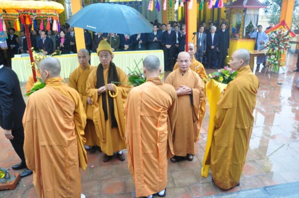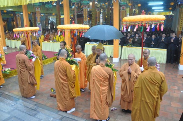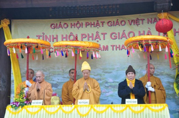 Đúng 9h, toàn thể chư tôn đức Tăng Ni cùng quý vị lãnh đạo tỉnh Hà Tĩnh long trọng cung nghênh Đức Pháp chủ cùng chư Tôn đức quang lâm chứng minh và chú nguyện cho buổi lễ.