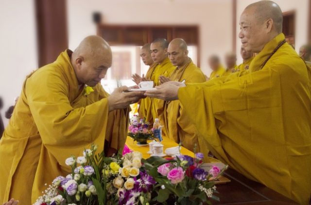 Trước tiên, Hòa thượng Thích Bảo Nghiêm cung kính quỳ trước bàn Phật dâng chén trà cúng Phật, cúng Tổ nhằm tỏ lòng tri ân với Tam Bảo và Tổ tiên trong nhiều đời nhiều kiếp. Tiếp đó, đại diện chư Tôn đức Tăng là hàng đệ tử cung kính dâng chén trà đối trước HT Thích Bảo Nghiêm, vị Thầy của mình bày tỏ tinh thần tri ân được gửi gắm qua chén trà thơm thảo thể hiện qua nghi thức này và nghi thức cứ tiếp nối thế hệ sau tiếp tục dâng trà cho những vị Thầy của mình.