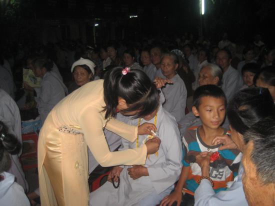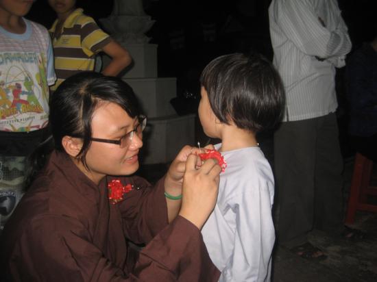 Đại diện CLBTN Phật tử chùa Cảm Sơn thành kính tay cầm bông hồng vàng cài lên ngực chư tôn đức, bông hồng đỏ được cài cho những ai may mắn còn cha mẹ, màu trắng là những ai không còn đấng sinh thành để chăm sóc và báo hiếu.