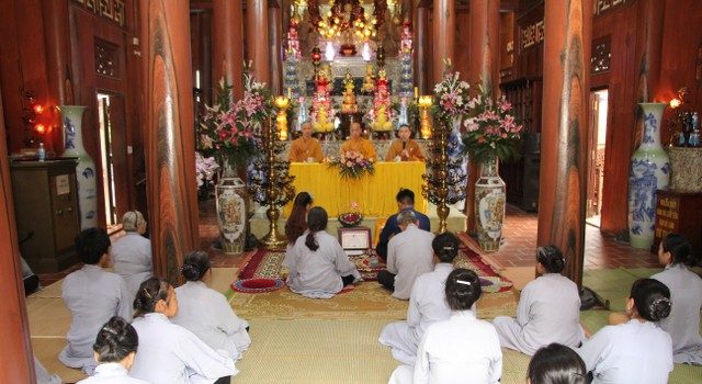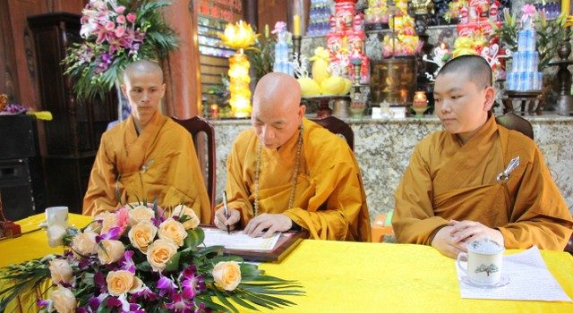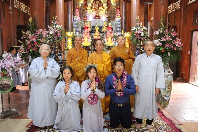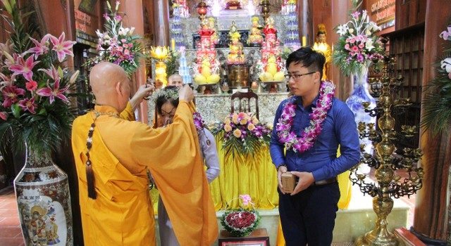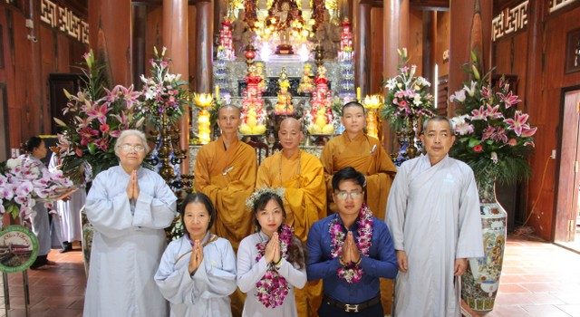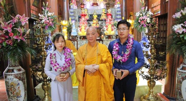 Mở đầu buổi lễ, chư Tăng đã tác pháp quy y Tam Bảo để hai bạn nương tựa tu học Phật pháp, xây dựng hạnh phúc gia đình. Tiếp đó, đôi bạn đã đối trước Tam Bảo đọc lời thệ nguyện yêu thương nhau trọn đời và hộ trì chính pháp; đỉnh lễ công ơn sinh thành, dưỡng dục của song thân; đỉnh lễ tôn trọng sự bình đẳng của nhau. Sau đó, đích thân Thượng tọa trao quà cưới cho hai bạn. Trong niềm hoan hỷ của buổi lễ, quý Thầy đã khuyến tấn tân lang, tân nương phải sống trọn vẹn bổn phận làm vợ và làm chồng, làm dâu hiền, rể thảo cùng xây dựng hạnh phúc gia đình theo tinh thần hiểu biết và thương yêu của nhà Phật.