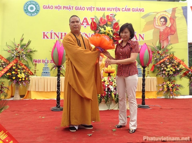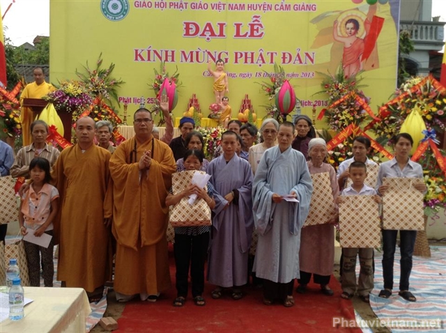 Ngay tại buổi lễ, Đại đức Thích Thanh Hiền – trưởng BTS GHPGVN huyện Cẩm Giàng cũng đã thay mặt Tăng Ni Phật tử Phật giáo Cẩm Giàng trao tặng 20 xuất quà cho các gia đình chính sách, người neo đơn không nơi nương tựa với tổng giá trị là 20 triệu đồng.