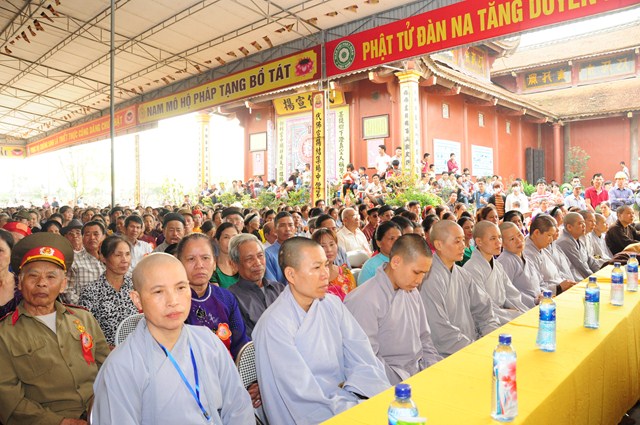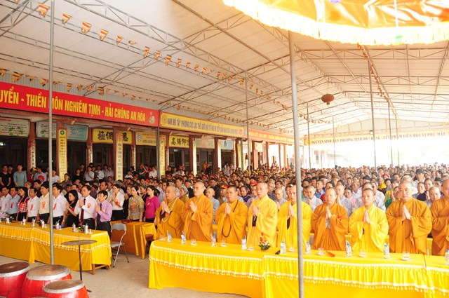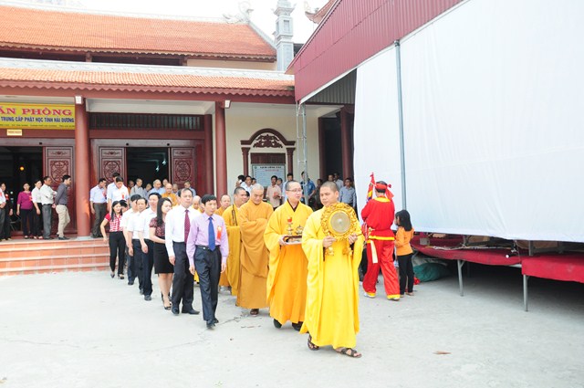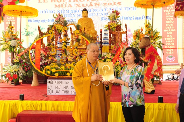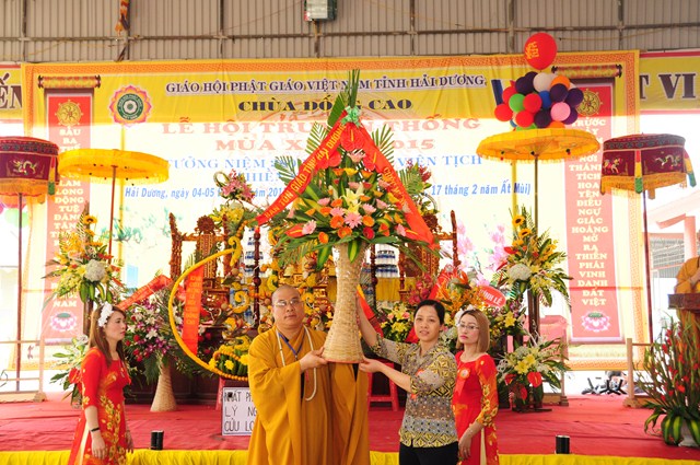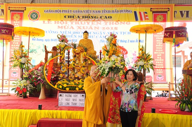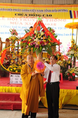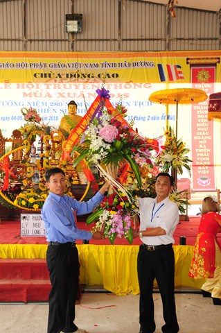 Tiếp đó, TT. Thích Thanh Vân- Trưởng BTC đã đón nhận những lẵng hoa chúc mừng từ bà Đặng Thị Bích Liên thứ trưởng Bộ văn hóa thể thao và du lịch, các lẵng hoa chúc mừng của các ông bà lãnh đạo HĐND, UBND, UB MTTQVN tỉnh Hải Dương, thành phố Hải Dương, xã Tân Hưng và các thôn xã lân cận.