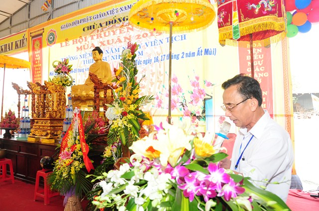 Cũng trong buổi lễ, ông: Phạm Quang Sản – Phó chủ tịch thường trực UB MTTQVN tỉnh Hải Dương đã có bài phát biểu nói lên sự đồng hành của Phật giáo đối với dân tộc, góp phần rất lớn vào sự phát triển, giữ gìn bản sắc văn hóa dân tộc. Đồng thời ông cũng gửi lời tri ân tới Chư tôn đức Tăng Ni tổ đình Đống Cao đã cùng với chính quyền, nhân dân địa phương góp phần tạo nên sự thành công của lễ hội năm nay.