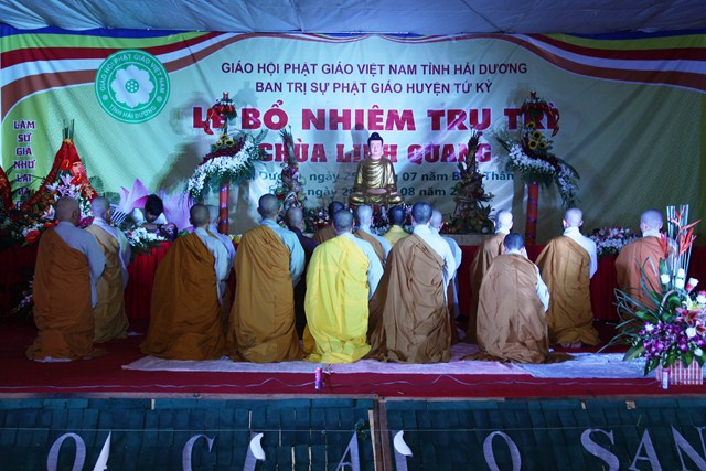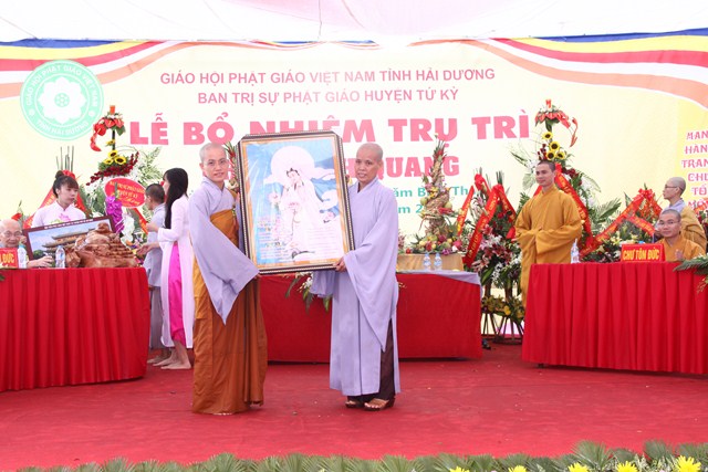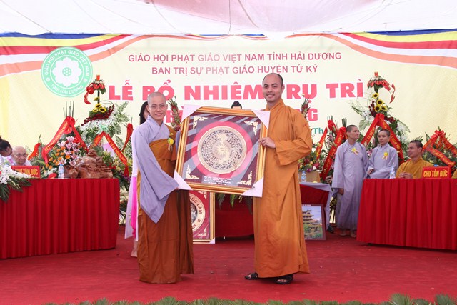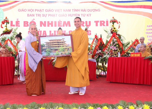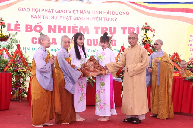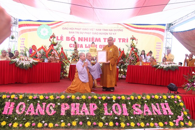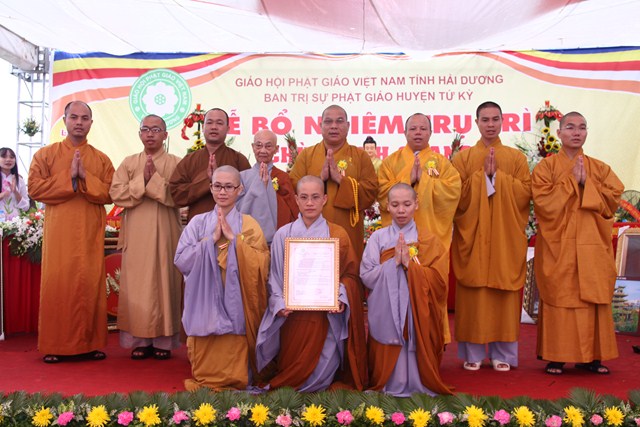 Để ghi nhận những đóng góp trong thời gian qua, đồng thời trợ duyên cho các hoạt động Phật sự của Sư cô trong thời gian tới, BTS GHPGVN huyện Tứ Kỳ đã trao quyết định chính thức bổ nhiệm trụ trì chùa Linh Quang cho Sư cô.