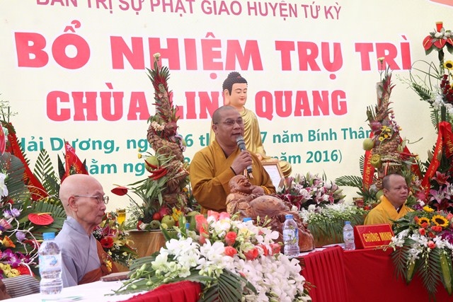 Để có thêm hành trang cho Sư cô tân Trụ trì và chư Phật tử chùa Linh Quang bước tiếp chặng đường mới, Ni trưởng Tịnh Thường – thầy Bổn sư của Sư cô cũng đã ân cần nhắn nhủ những điều cần thiết của một vị Trụ trì và gửi gắm BTS cùng chính quyền địa phương giúp đỡ cho Sư cô khi không có thầy Bổn sư bên cạnh. Thượng tọa Phó ban Thường trực BTS GHPGVN tỉnh Hải Dương cũng từ bi nhắn nhủ những điều càn thiết để Sư cô hòa nhập cộng đồng mới, và đề nghị BTS huyện cùng chính quyền địa phương quan tâm hỗ trợ và giúp đỡ trong các hoạt động của nhà chùa, đặc biệt là vấn đề mở rộng khuôn viên đất chùa, để có thể tổ chức những hoạt động tu tập và hoằng pháp tốt hơn.