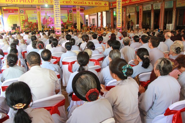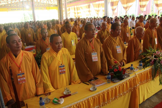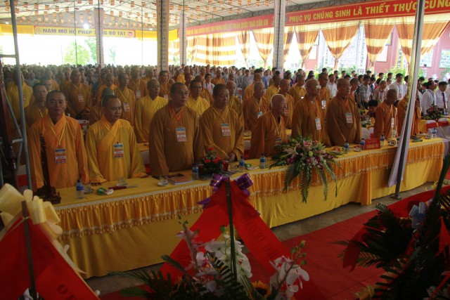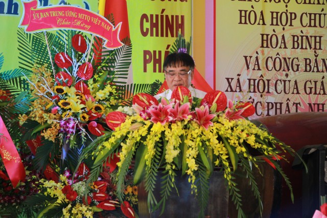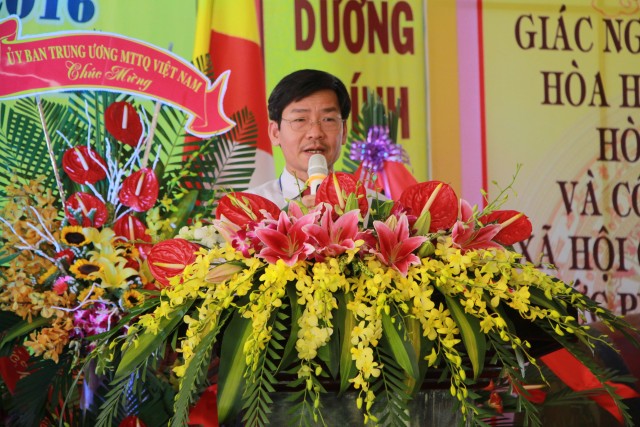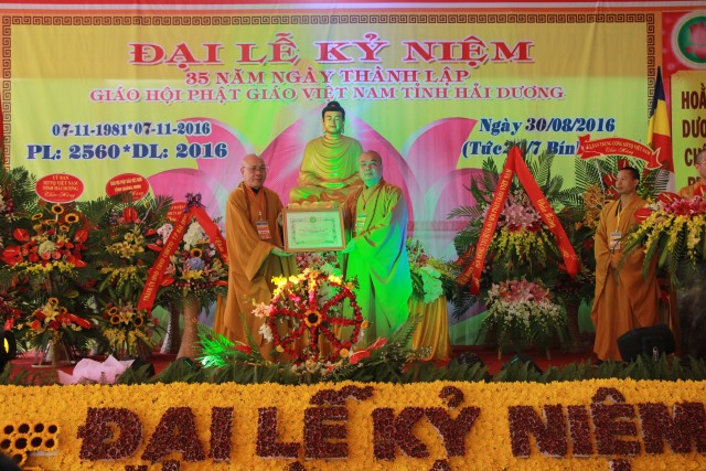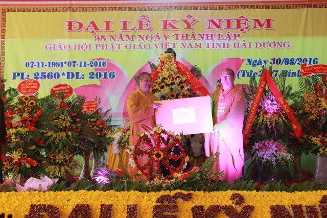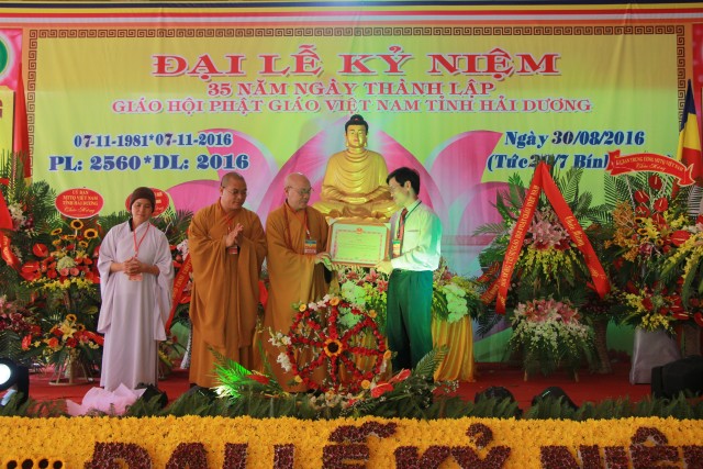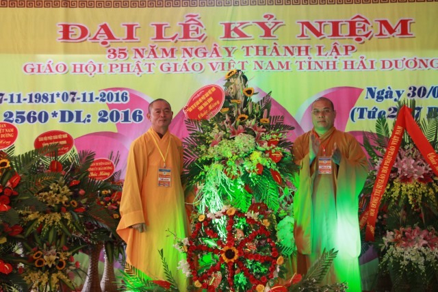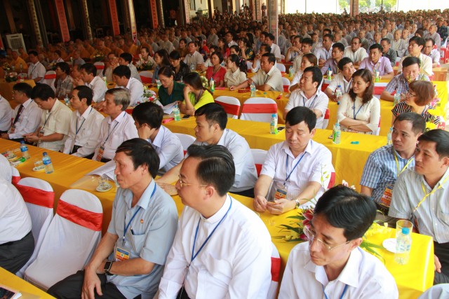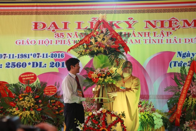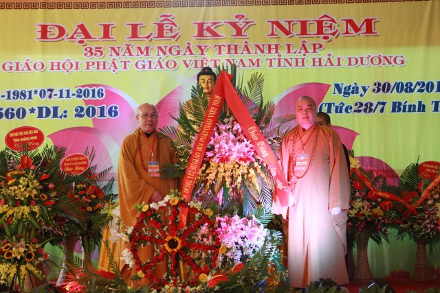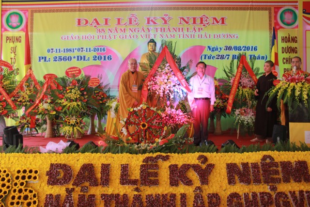 Thay mặt lãnh đạo chính quyền tỉnh phát biểu tại buổi lễ, ông Lương Văn Cầu, Phó Chủ tịch UBND tỉnh Hải Dương nhấn mạnh: “Kể từ nhiệm kỳ thứ nhất (từ 1981) cho đến nay, Giáo hội Phật giáo Việt Nam và các thành viên Giáo hội luôn đồng hành cùng dân tộc và thực hiện nhất quán phương châm “ích đạo, lợi đời”. Với tinh thần đoàn kết, kế thừa, phát huy những giá trị tốt đẹp của Phật pháp từ hình thức đến nội dung đã minh chứng Giáo hội Phật giáo Việt Nam và các thành viên Giáo hội luôn không ngừng phát triển. Trong 35 năm qua, Giáo hội Phật giáo Việt Nam đã đạt được một số thành tựu nổi bật, tiêu biểu đó là: Nêu cao tinh thần đại đoàn kết dân tộc, tập hợp tăng, ni, phật tử một lòng vì hạnh phúc nhân sinh; ủng hộ và tích cực thực hiện các chủ trương của Đảng, Pháp luật, Nhà nước, các phong trào ích nước, lợi dân, vừa xây dựng Giáo hội vừa góp phần xây dựng đất nước. Góp phần quan trọng trong việc cùng với Đảng, Nhà nước đấu tranh chống những luận điệu xuyên tạc của các thế lực xấu, nhằm gây chia rẽ tôn giáo và khối đại đoàn kết toàn dân tộc. Định hướng mọi hoạt động của các cấp Giáo hội từ Trung ương đến cơ sở góp phần tích cực trong việc xây dựng đất nước ngày càng giàu mạnh, dân chủ, công bằng, văn minh”.