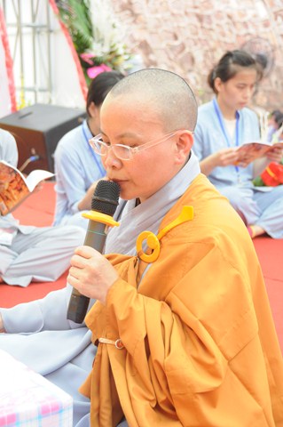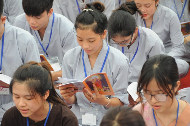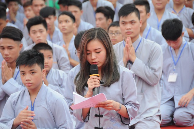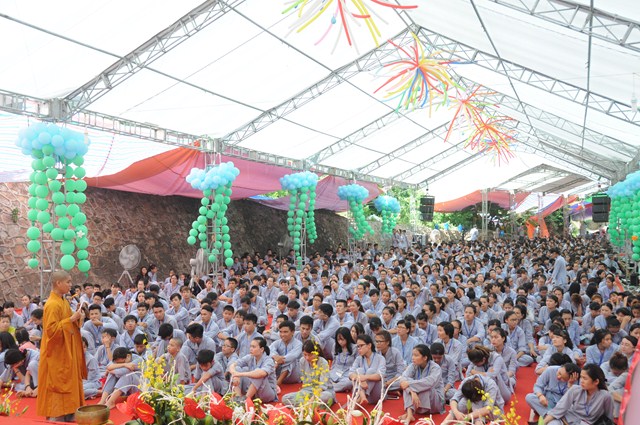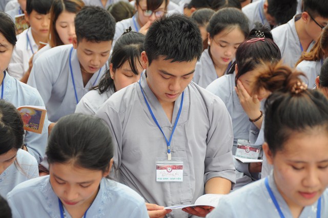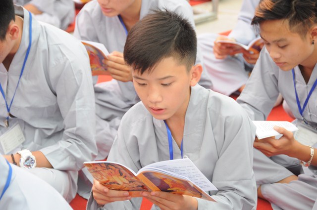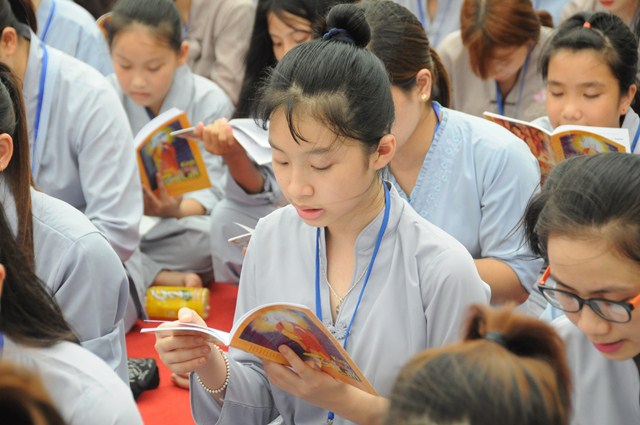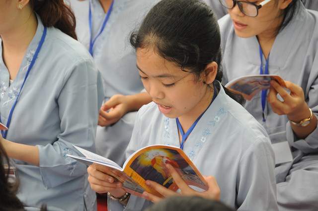Ngay sau khi kết thúc buổi lễ khai mạc, hơn 1000 khóa sinh đã chính thức bước vào thời khóa tu tập của khóa tu: “ Một ngày yêu thương” lần thứ V với thời khóa tụng kinh Vu Lan – Báo Hiếu. Sư Cô Thích Giới Định đã dẫn cho các em biết cách tụng kinh, mục đích của việc tụng kinh và đặc biệt hơn nữa là qua lời Phật dạy trong kinh Vu lan – Báo Hiếu, các em khóa sinh đã hiểu được phần nào công sinh thành dưỡng dục của cha và mẹ, những nỗi vất vả, chịu mọi khổ đau khi sinh nở cũng như nuôi nấng các em để các em có được thân hình, vóc dáng và cuộc sống như ngày hôm nay.