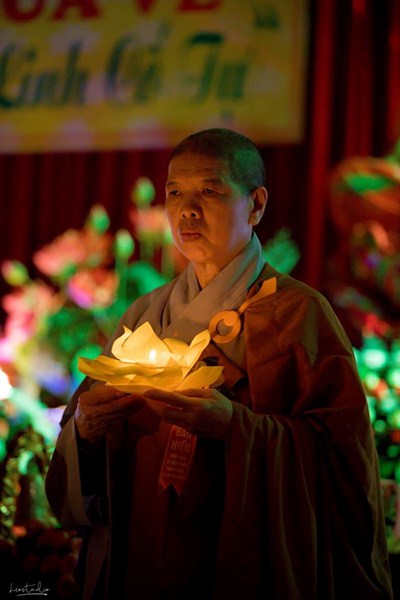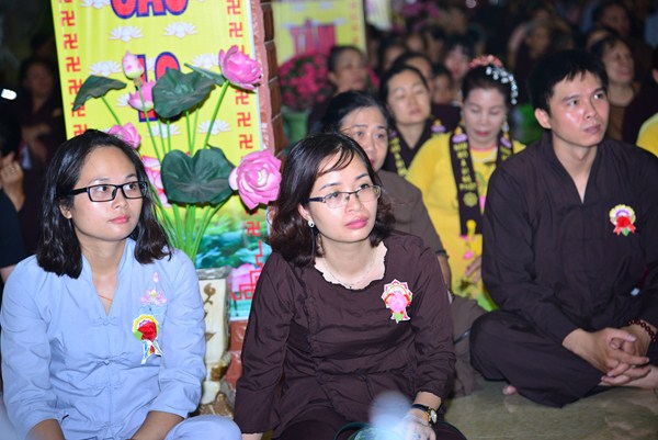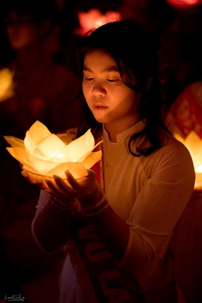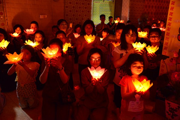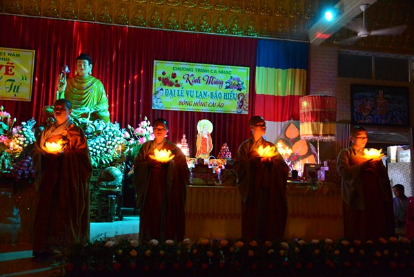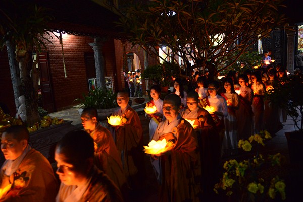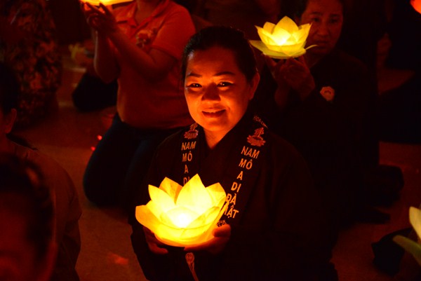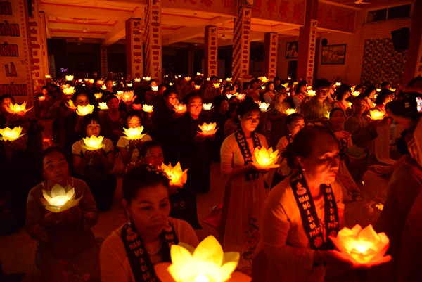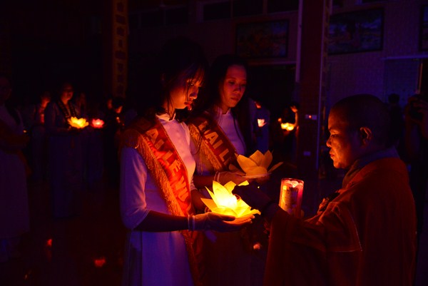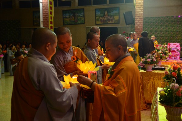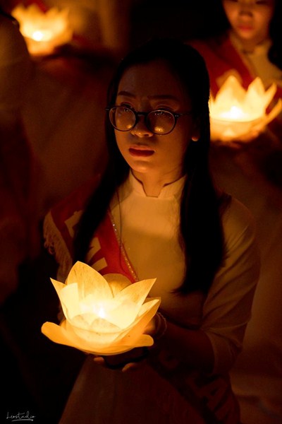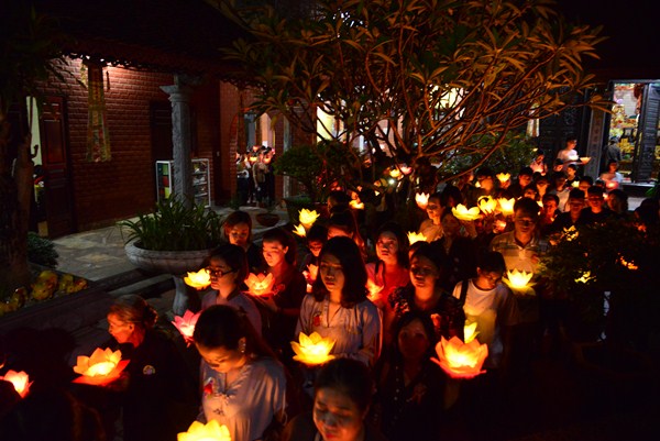 Thời khắc linh thiêng nhất của buổi lễ đã tới khi chư tôn đức Ni hiện tiền cử hành nghi lễ niêm hương bạch Phật, cầu nguyện thế giới hòa bình, chúng sinh an lạc và bắt đầu bước vảo đêm thắp nến tri ân cha mẹ. Ni sư Thích Tâm Chính đại vì cho Ni chúng chùa Vẽ đã xin ánh sáng đầu tiên từ ban Phật rồi truyền ánh sáng đó cho chư tôn đức chứng minh và các em thanh thiếu niên Phật tử, từng ngọn nến lung linh đã dần được thắp sáng khắp giảng đường càng làm cho buổi lễ trở nên linh thiêng và huyền ảo hơn, trên tay mỗi Phật tử là một ngọn đèn hoa đăng tượng trưng cho tình thương của cha mẹ dành cho con cái, mỗi người con sẽ thầm nguyện với lòng mình, nguyện giữ cho ngọn nửa đó để ngọn lửa không bao giờ tắt, cũng như tình thương của cha mẹ dành cho con cái vậy, đó là tình thương bao la, rộng lớn, tình thương không ngơi nghỉ và thầm cầu nguyện cầu ông bà cha mẹ hiện tiền được phúc thọ tăng long, sống vui, sống khỏe bên con cháu.