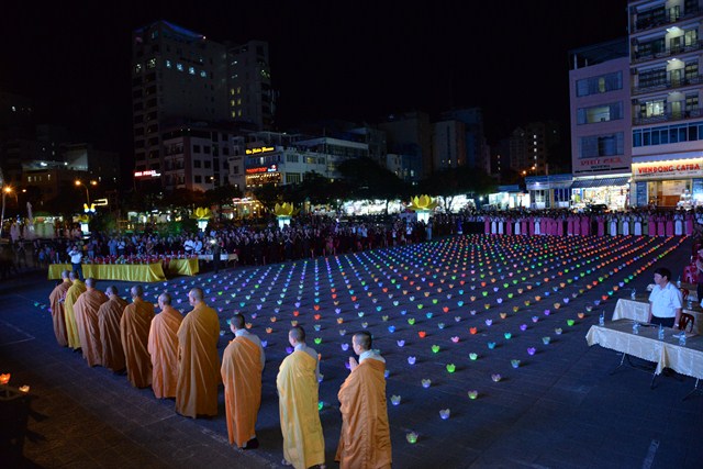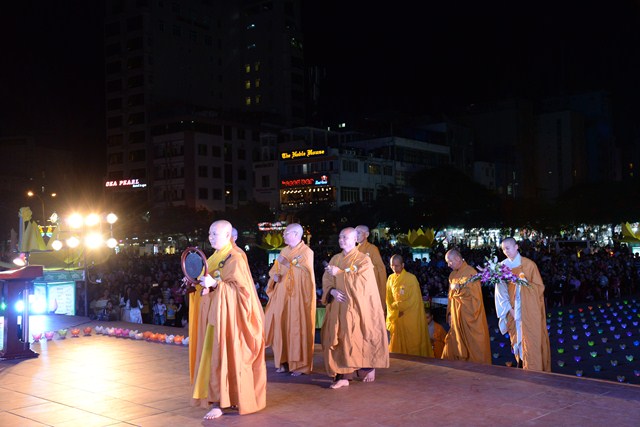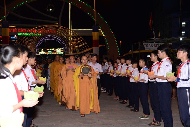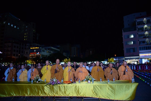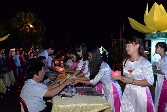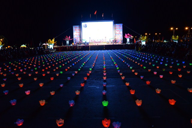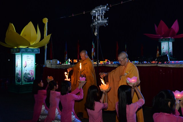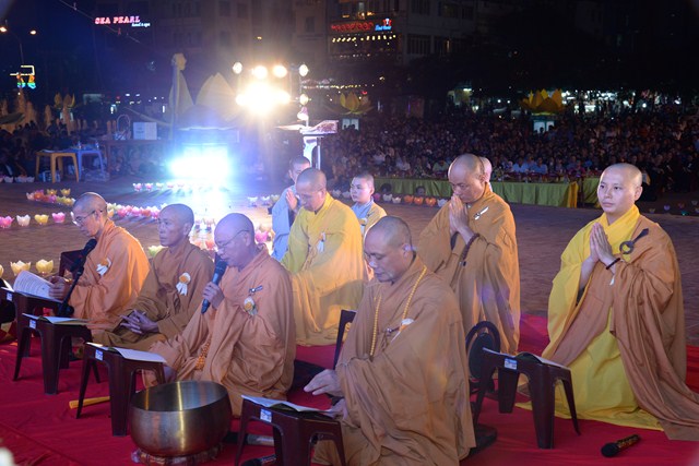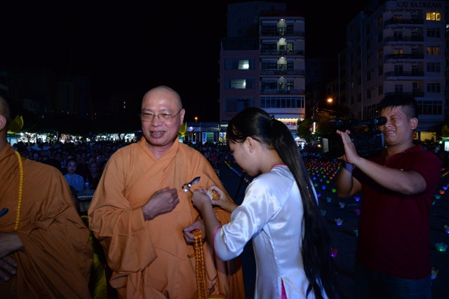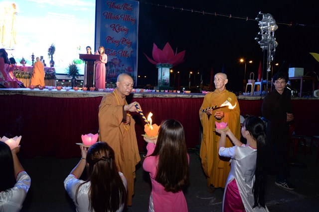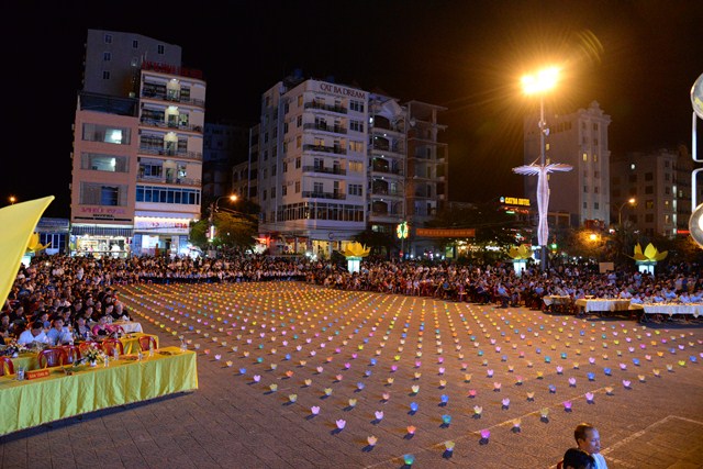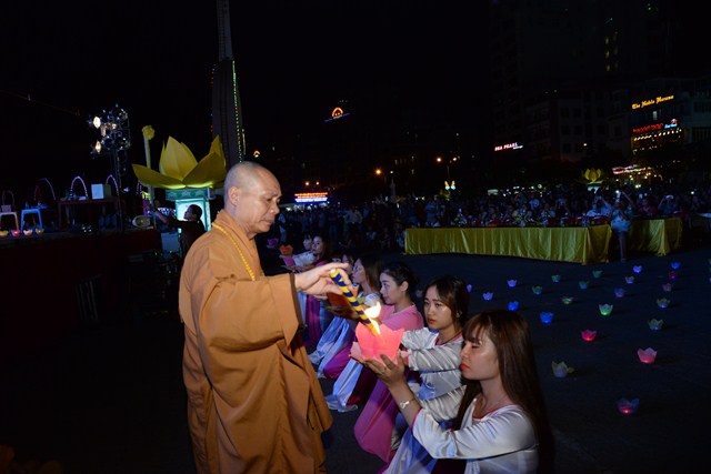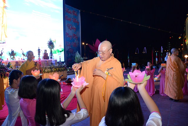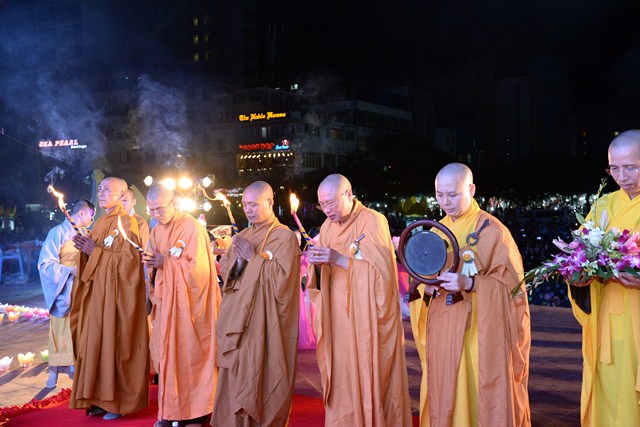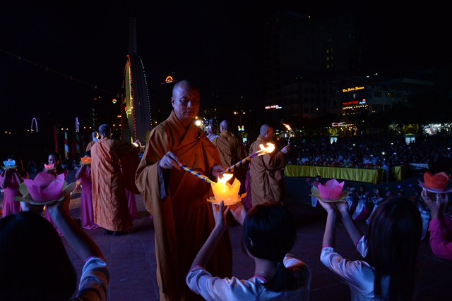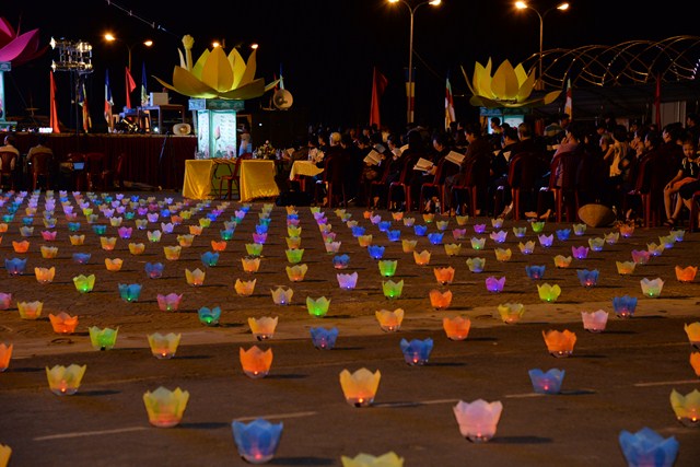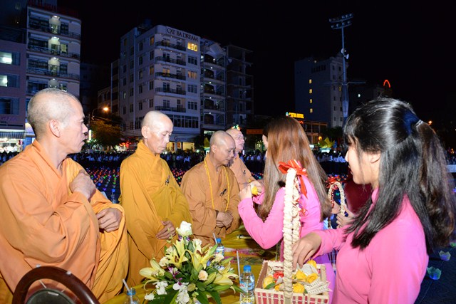 Thời khắc thiêng liêng nhất của buổi lễ đã tới khi toàn thể chư tôn đức tăng ni xin ngọn lửa của tình thương và sự hiểu biết từ bàn Phật rồi truyền sang cho các bạn thanh thiếu niên, quý quan khách, quý Phật tử, du khách thập phương gần xa. Hơn 10 ngàn ngọn hoa đăng đã dần được thắp sáng giữa biển đảo thân yêu, làm xua tan đi màn vô minh si ám để tri ân ông bà cha mẹ hiện tiền, ông bà cha mẹ đã quá vãng và tri ân các anh hùng liệt sỹ, đồng bào tử nạn đã hy sinh cho độc lập tự do của Đất nước. Hơn 10 ngàn ngọn nến lung linh, huyền ảo đó đã được chư tôn thiền đức tăng ni, quý Phật tử, quý quan khách và khách du lịch thả ra biển mang theo đó là tình yêu thương của con cái đối với ông bà cha mẹ và lời khấn nguyện cho ông bà cha mẹ hiện tiền được phúc thọ tăng long, ông bà cha mẹ đã quá vãng cũng như các anh hùng liệt sỹ, chiến sỹ trận vong, đồng bào tử nạn sớm được siêu sinh về miền Cực Lạc.