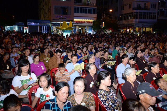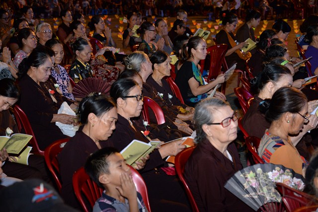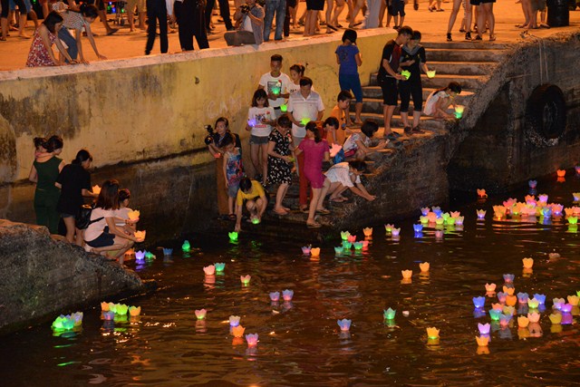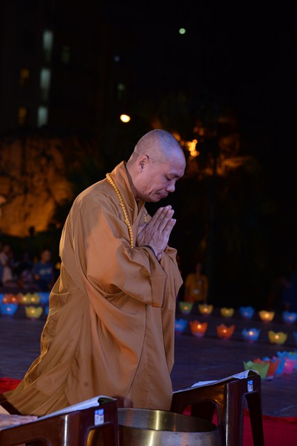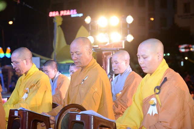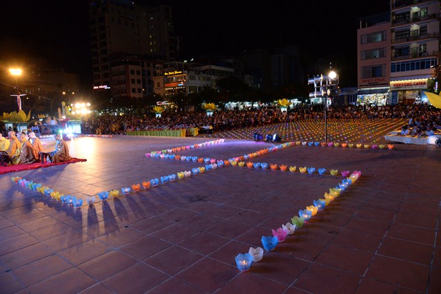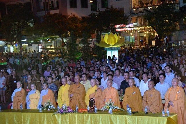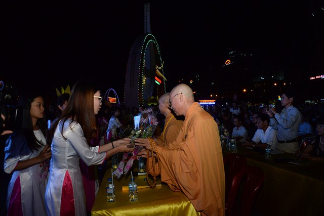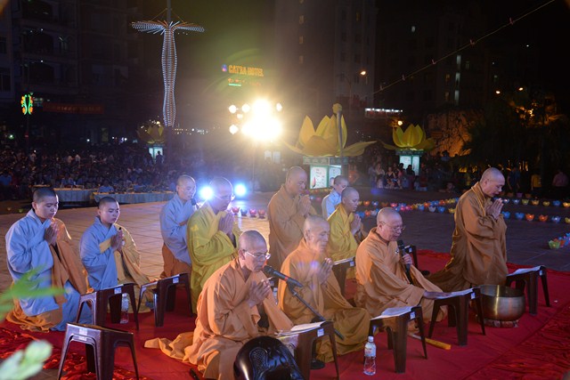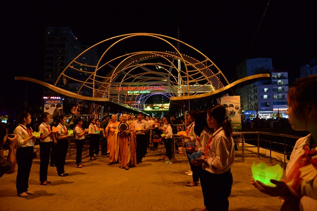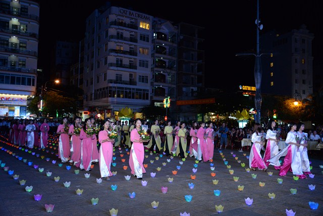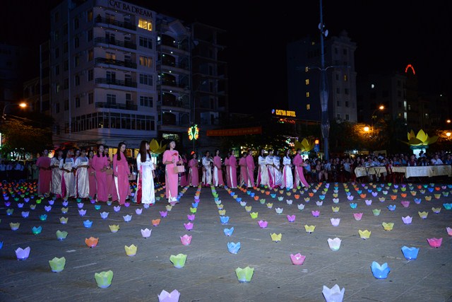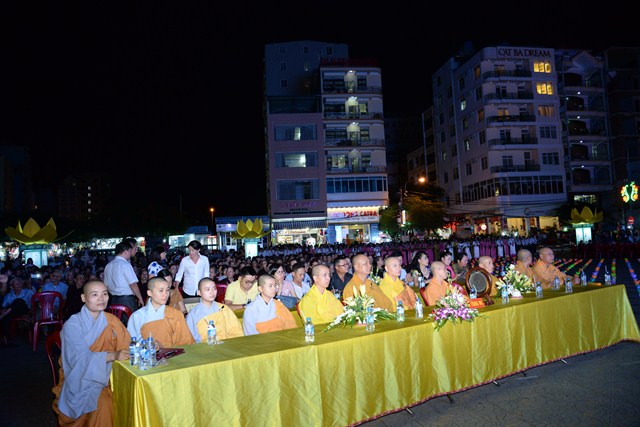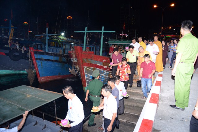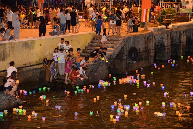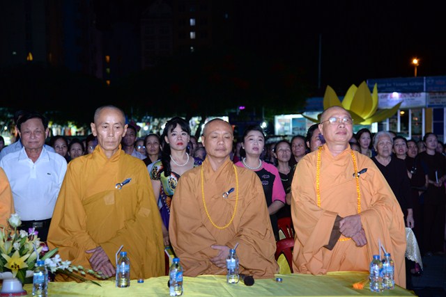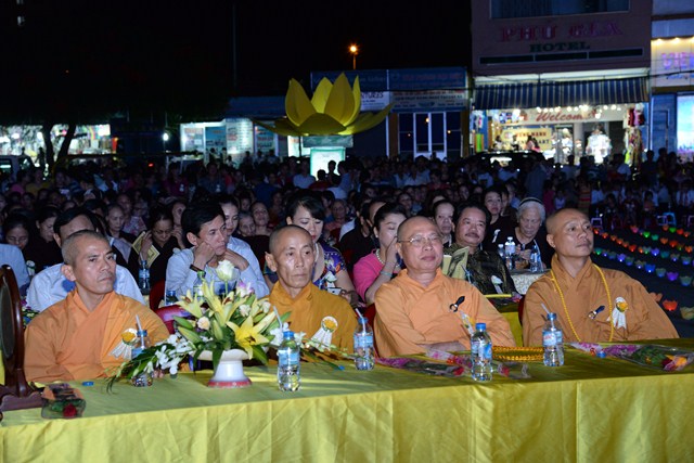 Thời khắc thiêng liêng nhất của buổi lễ đã tới khi toàn thể chư tôn đức tăng ni xin ngọn lửa của tình thương và sự hiểu biết từ bàn Phật rồi truyền sang cho các bạn thanh thiếu niên, quý quan khách, quý Phật tử, du khách thập phương gần xa. Hơn 10 ngàn ngọn hoa đăng đã dần được thắp sáng giữa biển đảo thân yêu, làm xua tan đi màn vô minh si ám để tri ân ông bà cha mẹ hiện tiền, ông bà cha mẹ đã quá vãng và tri ân các anh hùng liệt sỹ, đồng bào tử nạn đã hy sinh cho độc lập tự do của Đất nước. Hơn 10 ngàn ngọn nến lung linh, huyền ảo đó đã được chư tôn thiền đức tăng ni, quý Phật tử, quý quan khách và khách du lịch thả ra biển mang theo đó là tình yêu thương của con cái đối với ông bà cha mẹ và lời khấn nguyện cho ông bà cha mẹ hiện tiền được phúc thọ tăng long, ông bà cha mẹ đã quá vãng cũng như các anh hùng liệt sỹ, chiến sỹ trận vong, đồng bào tử nạn sớm được siêu sinh về miền Cực Lạc.