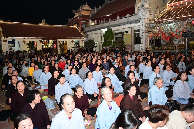 Tiếp đó, Đại đức Thích Nhật Thanh đã xưng tán 12 đại nguyện của Bồ tát Quán Thế Âm, toàn thể đại chúng lắng đọng tâm tư, giữ thân ý thanh tịnh, lắng nghe từng lời hạnh nguyện của Ngài, hòa chung với đó là tiếng niệm danh hiệu Bồ Tát Quán Thế Âm trầm hùng, da diết sau mỗi lời phát nguyện được vang lên, cầu nguyện Ngài luôn thị hiện ở cõi Ta Bà để cứu độ cho tất cả các chúng sinh đang còn lầm đường, lạc lối và chìm đắm trong biển khổ luân hồi.