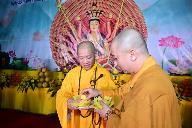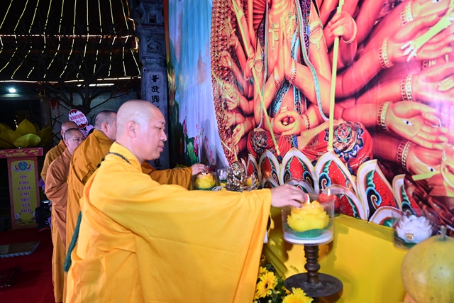 Dịp này, Thượng tọa Thích Thiện Thuận – Ủy viên thường trực ban Hoằng Pháp TƯ GHPGVN đã có một thời pháp thoại ngắn chia sẻ về hạnh nguyện Từ Bi – Cứu Khổ của Bồ Tát Quán Thế Âm, để từ đó áp dụng lời Phật dạy vào trong cuộc sống hàng ngày. Người Phật tử phải luôn lấy tâm từ bi, hạnh hỷ xả làm nền tảng cho sự phát triển hạnh lành, tâm “ Từ Bi” được coi là tâm Phật. Tâm “ Từ” là khả năng hiến tặng niềm vui cho tha nhân, cho người khác. Tâm “ Bi” là khả năng làm vơi đi nỗi khổ, niềm đau đang có mặt ở giây phút hiện tại. Nếu trong cuộc sống hàng ngày ai cũng có tâm Từ Bi, thắp sáng lòng Từ bi, hạnh Hỷ xả thì trong mỗi gia đình, mỗi cơ quan, mỗi trường học, …hay toàn xã hội sẽ luôn bình an và hạnh phúc.