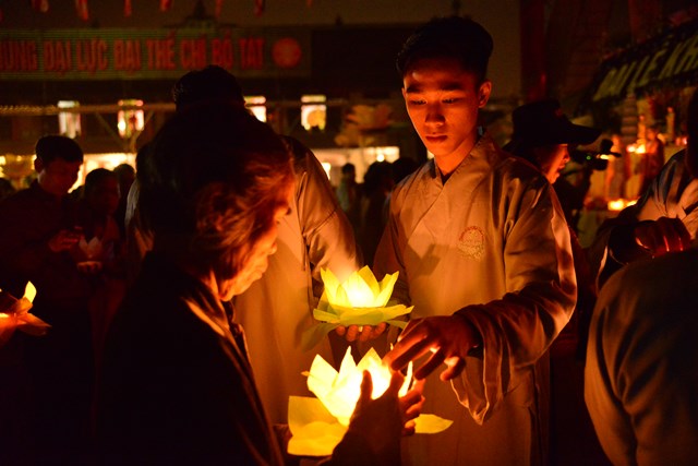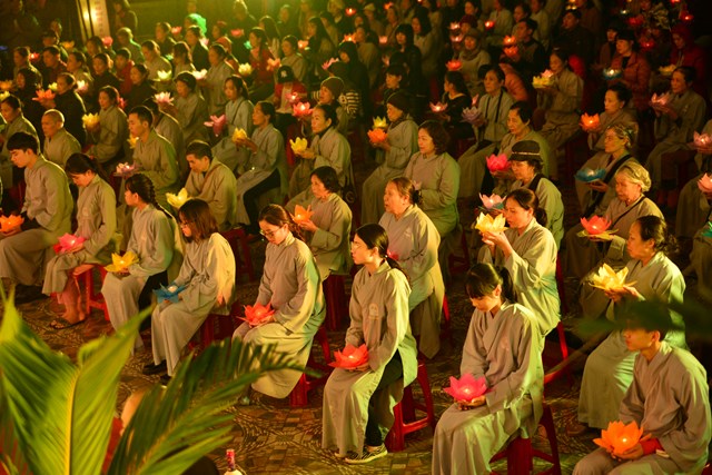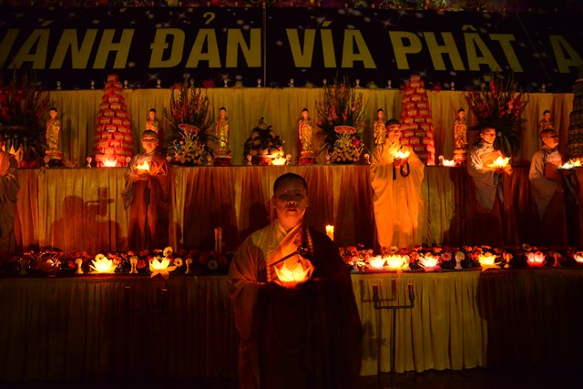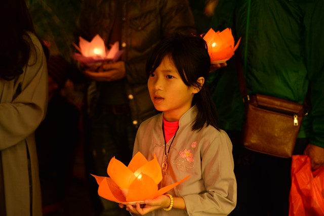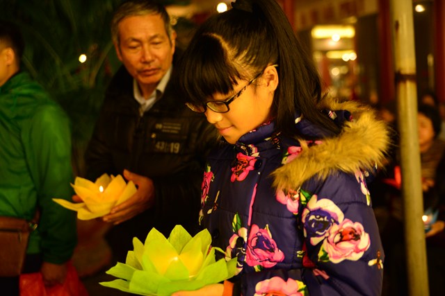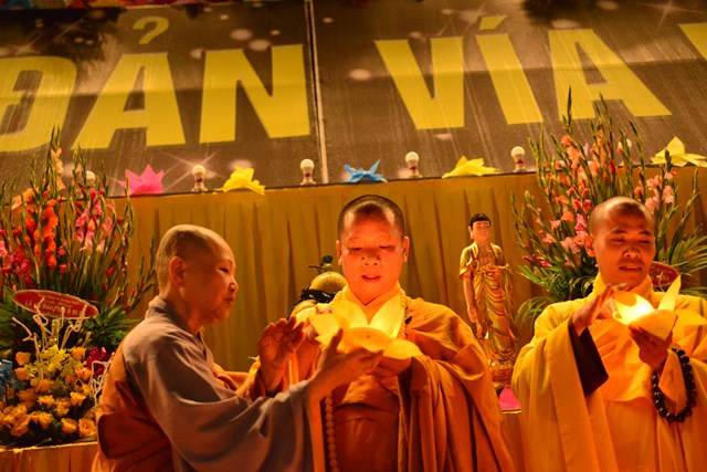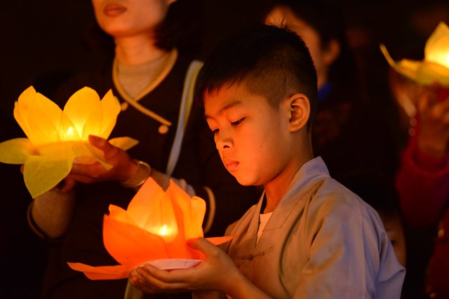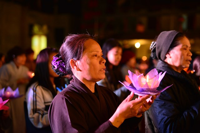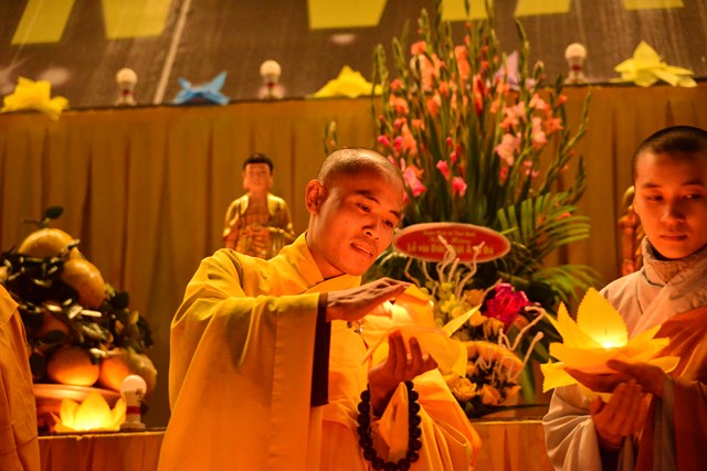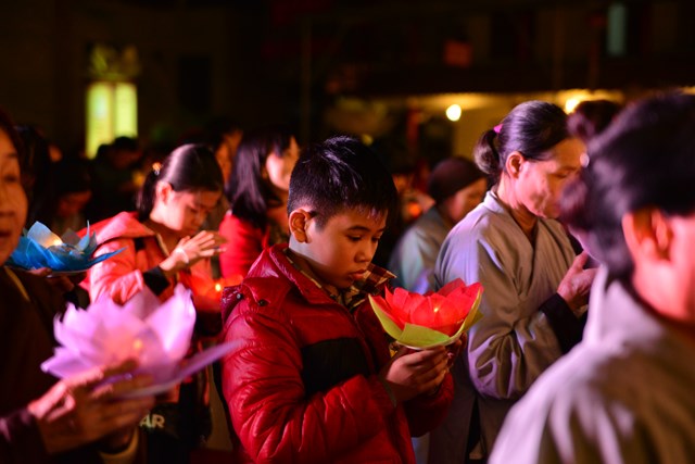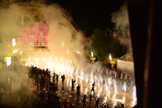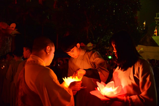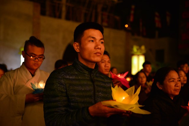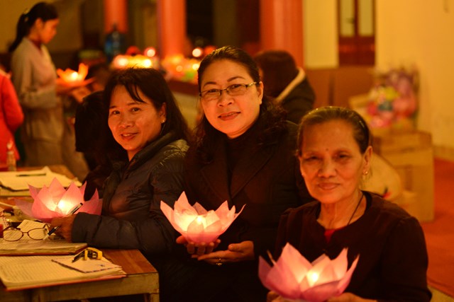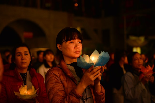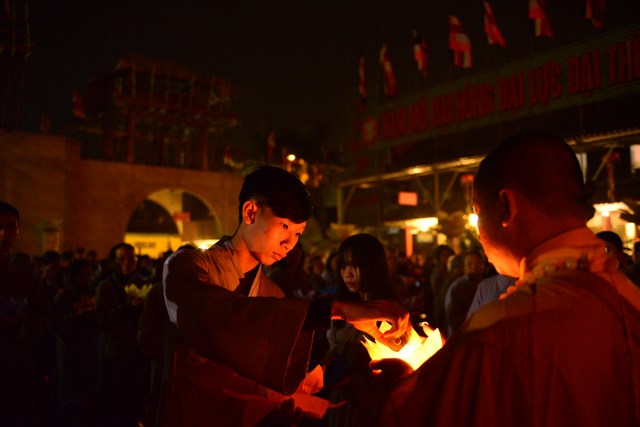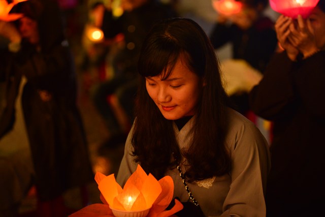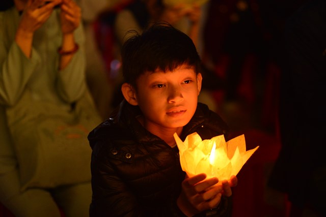 Tiếp đó, Chư tôn đức cùng các Phật tử đã làm lễ dâng hương và hoa đăng cúng dàng đức từ phụ A Di Đà trong không khí linh thiêng, thành kính, nguyện cầu cho thế giới hòa bình, chúng sinh an lạc, Phật pháp trường tồn. Đại đức Thích Giác Hảo – Trưởng BTC đại lễ đã xin ánh sáng của Từ bi và Trí tuệ từ bàn Phật rồi truyền sang cho chư tôn đức Tăng Ni, ánh sáng của lòng từ bi và trí tuệ đó đã lan tỏa khắp sân chùa, tạo nên một không gian linh thiêng, lung linh, huyền ảo, đầy sắc màu khiến cho buổi lễ càng trở nên ấm áp hơn, xua tan mùa đông giá lạnh của miền Bắc.