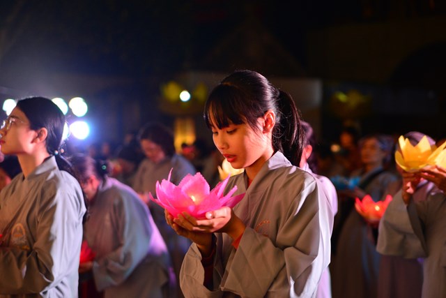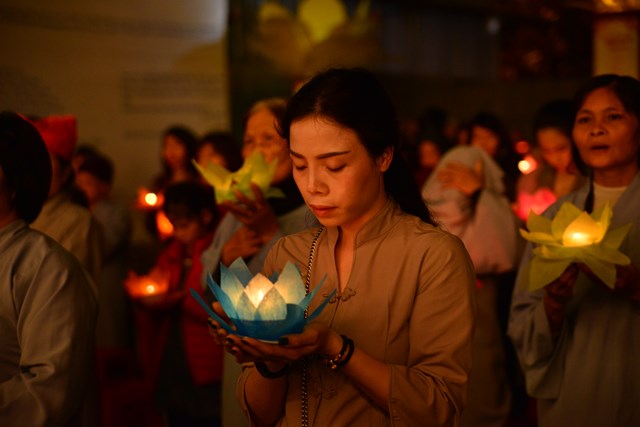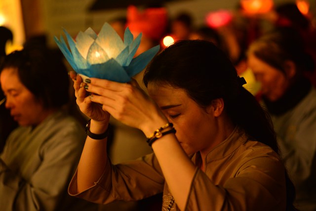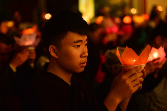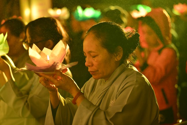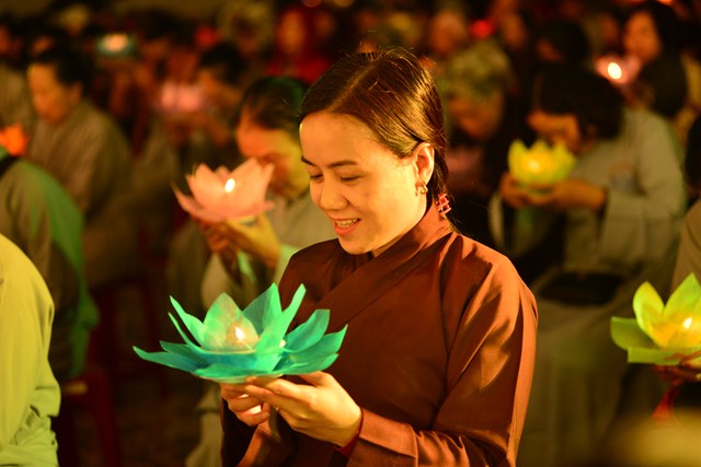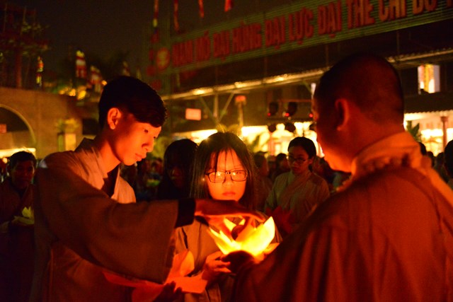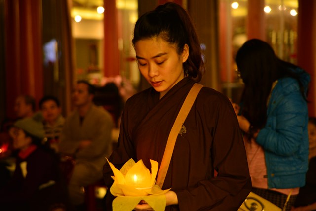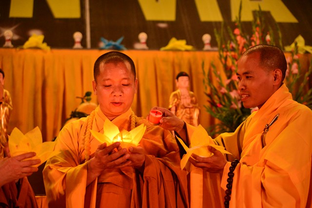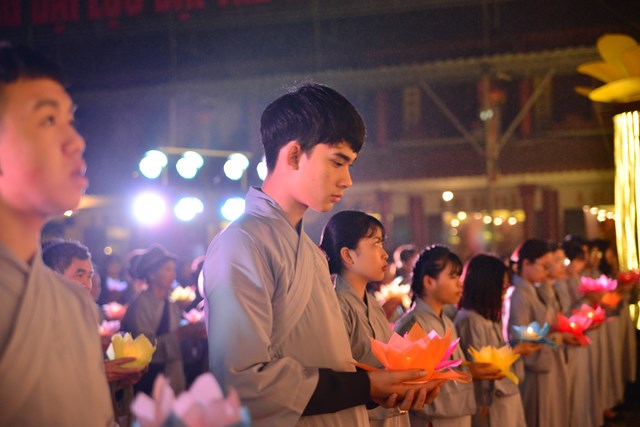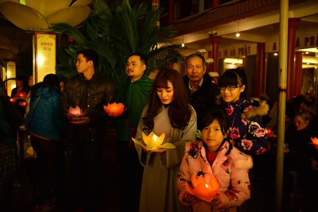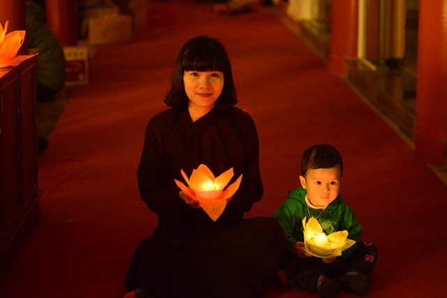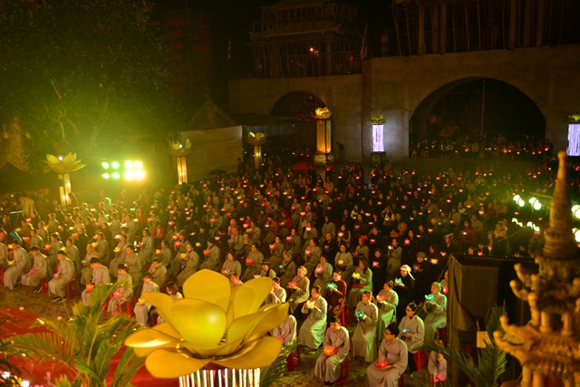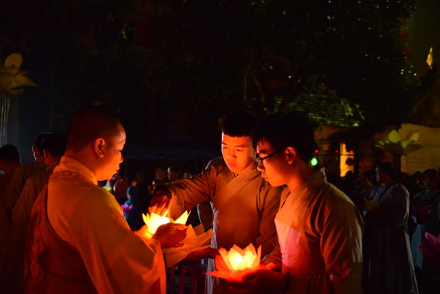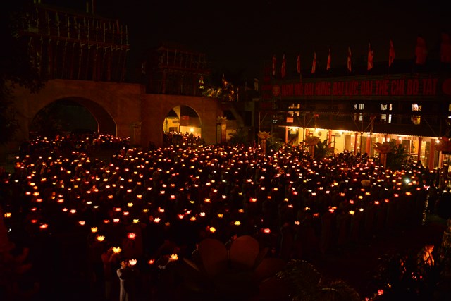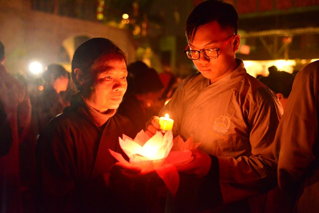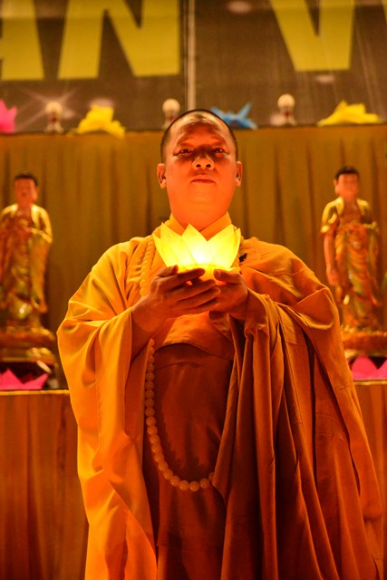 Tiếp đó, Chư tôn đức cùng các Phật tử đã làm lễ dâng hương và hoa đăng cúng dàng đức từ phụ A Di Đà trong không khí linh thiêng, thành kính, nguyện cầu cho thế giới hòa bình, chúng sinh an lạc, Phật pháp trường tồn. Đại đức Thích Giác Hảo – Trưởng BTC đại lễ đã xin ánh sáng của Từ bi và Trí tuệ từ bàn Phật rồi truyền sang cho chư tôn đức Tăng Ni, ánh sáng của lòng từ bi và trí tuệ đó đã lan tỏa khắp sân chùa, tạo nên một không gian linh thiêng, lung linh, huyền ảo, đầy sắc màu khiến cho buổi lễ càng trở nên ấm áp hơn, xua tan mùa đông giá lạnh của miền Bắc.