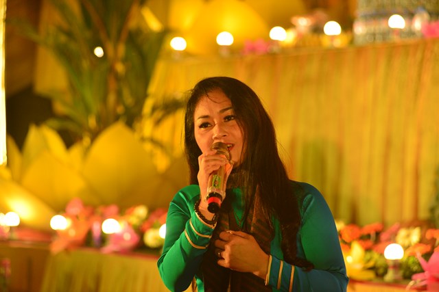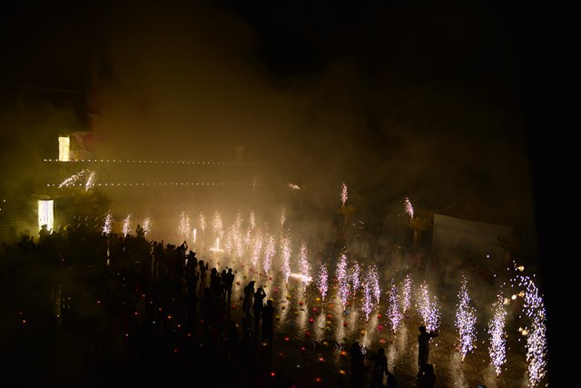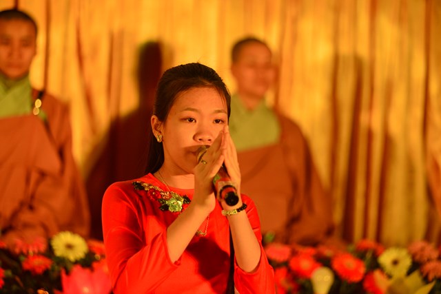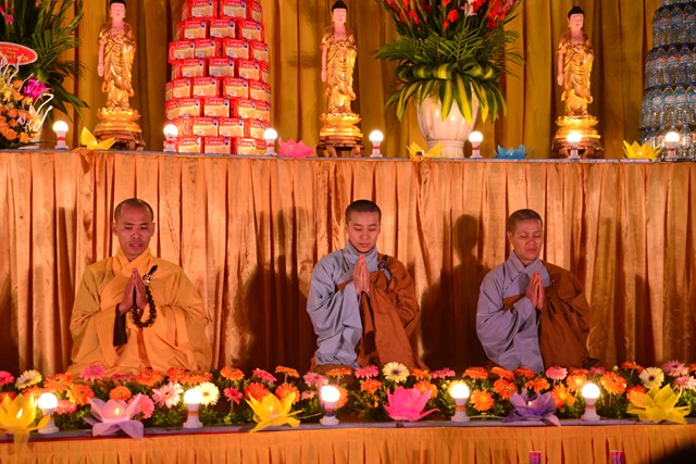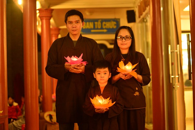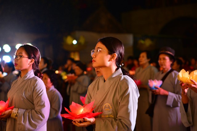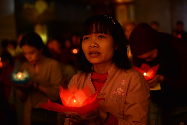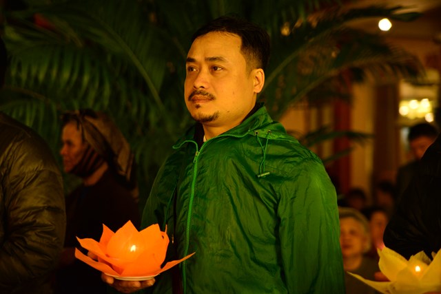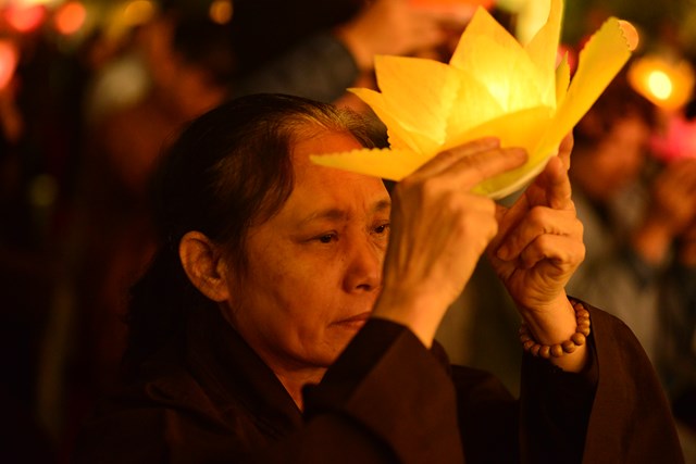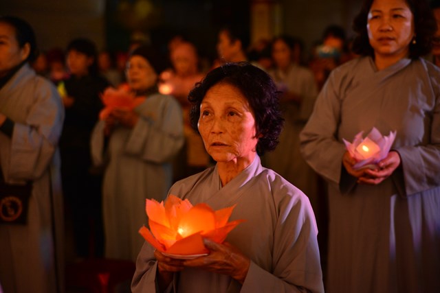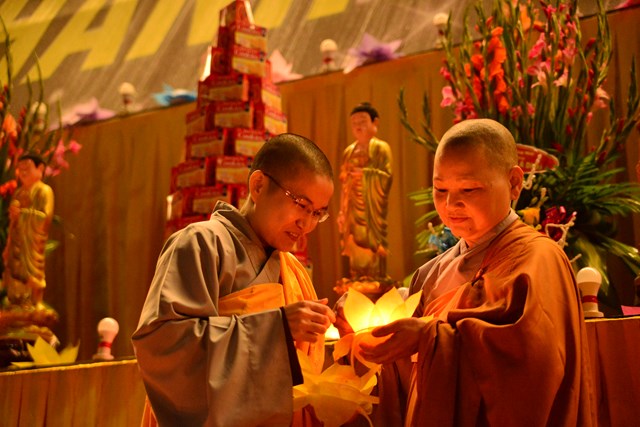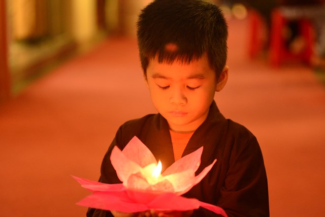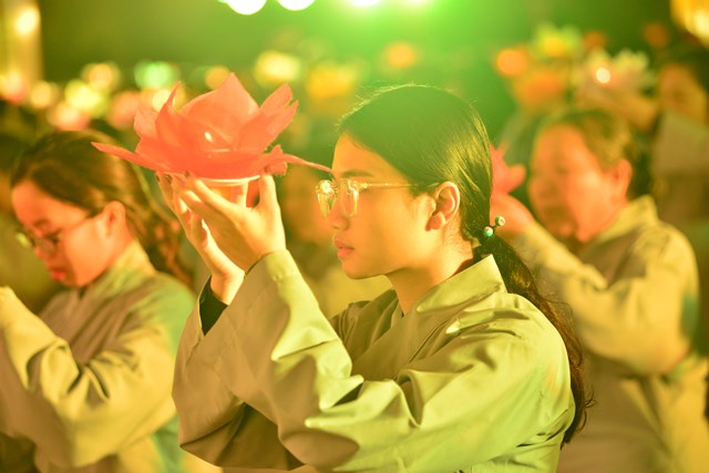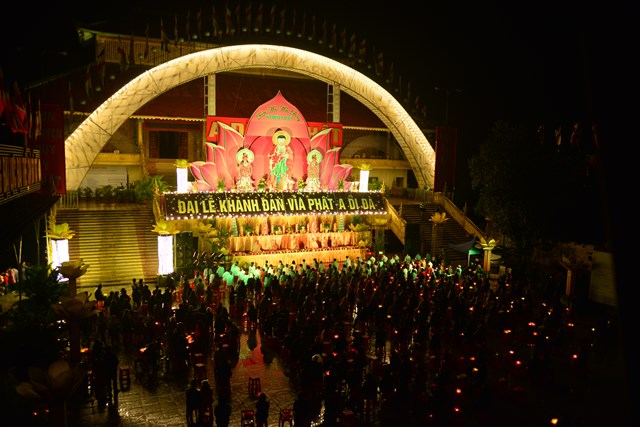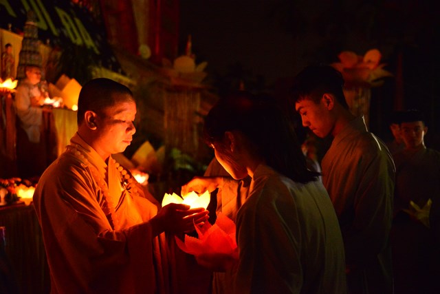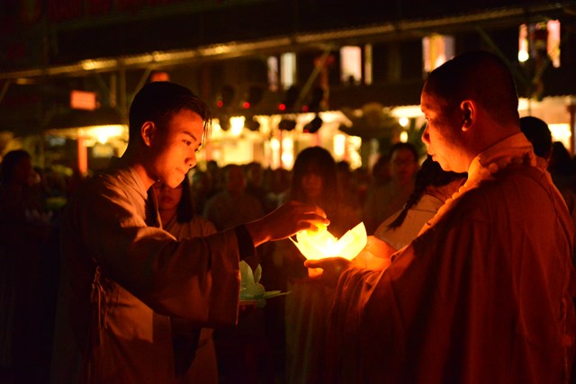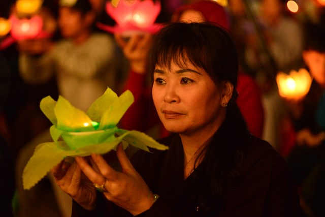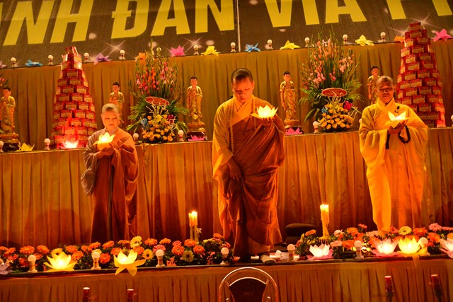 Tiếp đó, Chư tôn đức cùng các Phật tử đã làm lễ dâng hương và hoa đăng cúng dàng đức từ phụ A Di Đà trong không khí linh thiêng, thành kính, nguyện cầu cho thế giới hòa bình, chúng sinh an lạc, Phật pháp trường tồn. Đại đức Thích Giác Hảo – Trưởng BTC đại lễ đã xin ánh sáng của Từ bi và Trí tuệ từ bàn Phật rồi truyền sang cho chư tôn đức Tăng Ni, ánh sáng của lòng từ bi và trí tuệ đó đã lan tỏa khắp sân chùa, tạo nên một không gian linh thiêng, lung linh, huyền ảo, đầy sắc màu khiến cho buổi lễ càng trở nên ấm áp hơn, xua tan mùa đông giá lạnh của miền Bắc.