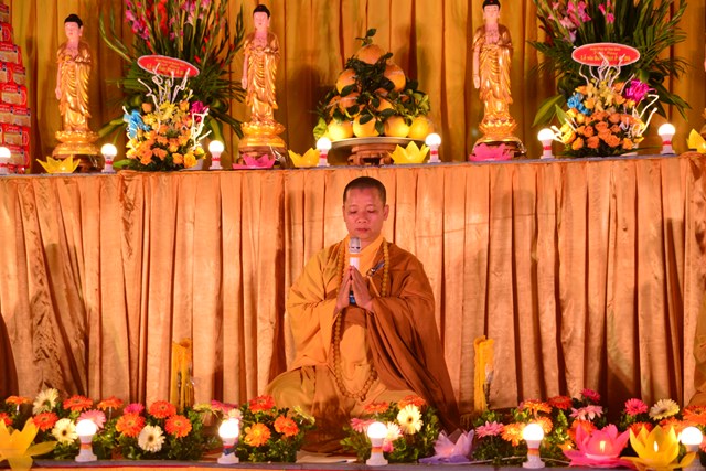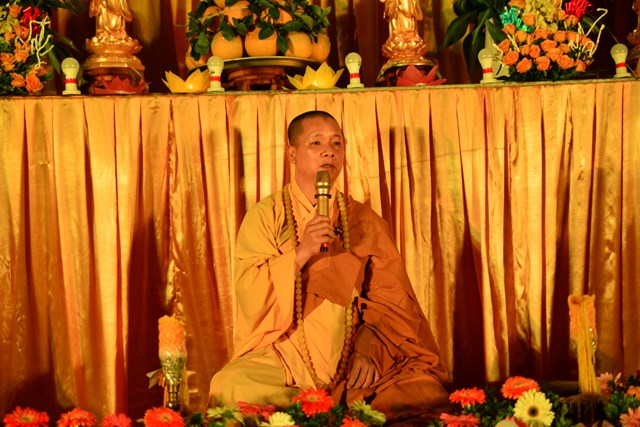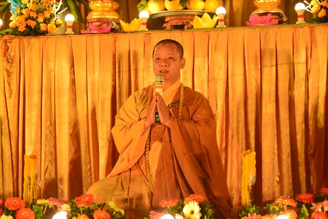 Sau nghi thức niệm Phật cầu gia bi, 1 phút tưởng niệm chư lịch đại Tổ Sư, các anh hùng liệt sỹ đã hy sinh cho độc lập, tự do của Đất nước, Đại đức Thích Long Thành – Chư tăng chùa An Hồng đã lên tuyên đọc Diễn văn khai mạc Đêm hoa đăng kính mừng khánh đản đức Phật A Di Đà PL. 2561 – DL. 2017.