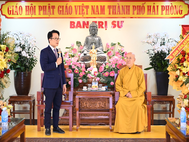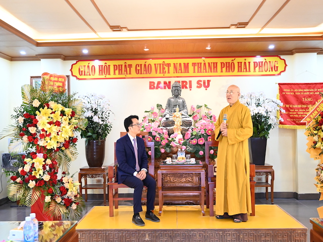 Lãnh đạo Ban Dân vận Thành ủy chia sẻ và chúc mừng Ban trị sự GHPGVN thành phố Hải Phòng đã đạt được những thành tựu Phật sự nổi bật trong năm vừa qua.