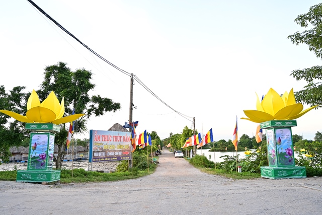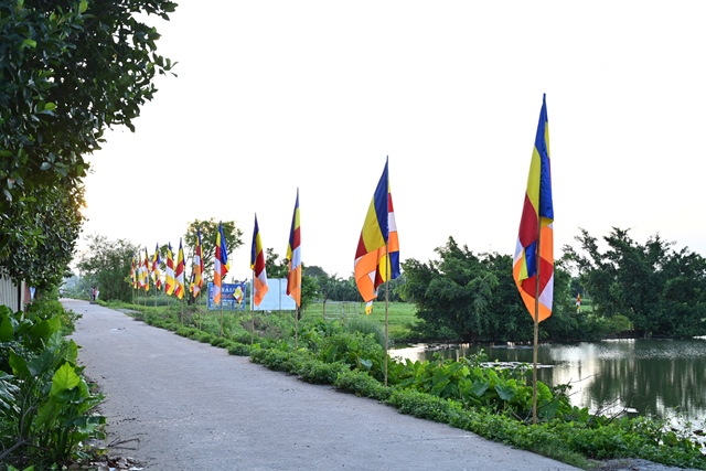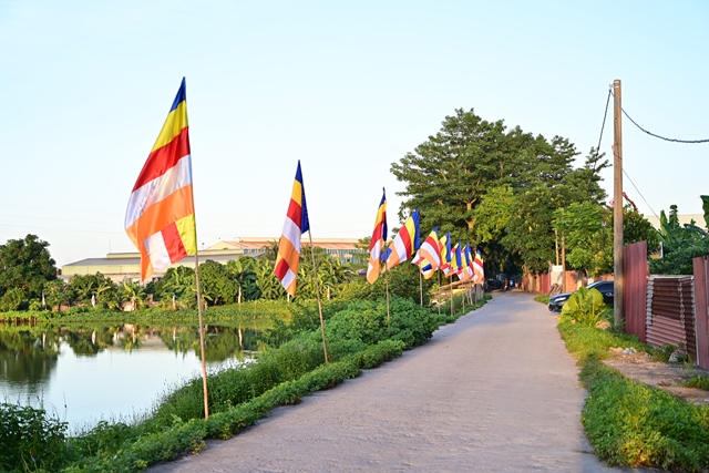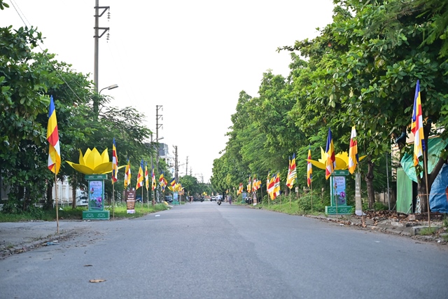 Đường vào chùa Hồng Phúc được trang trí cờ hoa rực rỡ đón khách thập phương về dự Đêm hoa đăng mùa Vu Lan – Báo Hiếu năm 2024