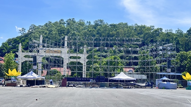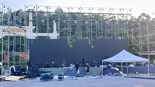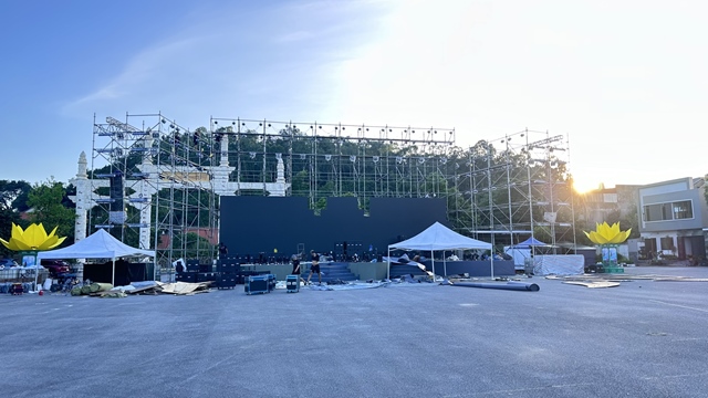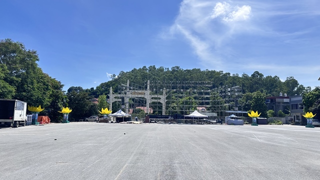 Sân khấu trước cổng chùa Hồng Phúc đang được hoàn thiện để chuẩn bị cho đại lễ diễn ra vào 19 giờ 30 phút ngày 10/08/2024