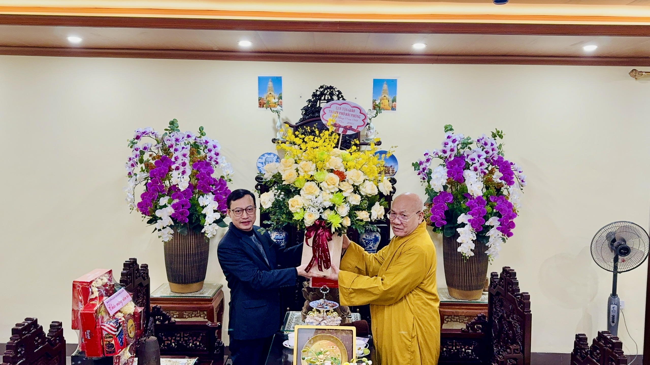 Dịp này, Phó Trưởng ban Tôn giáo Chính phủ, bà Trần Thị Minh Nga cũng đã trao tặng hoa và quà Tết chúc mừng đến chư Tôn đức Văn phòng Ban Trị sự GHPGVN TP. Hải Phòng.