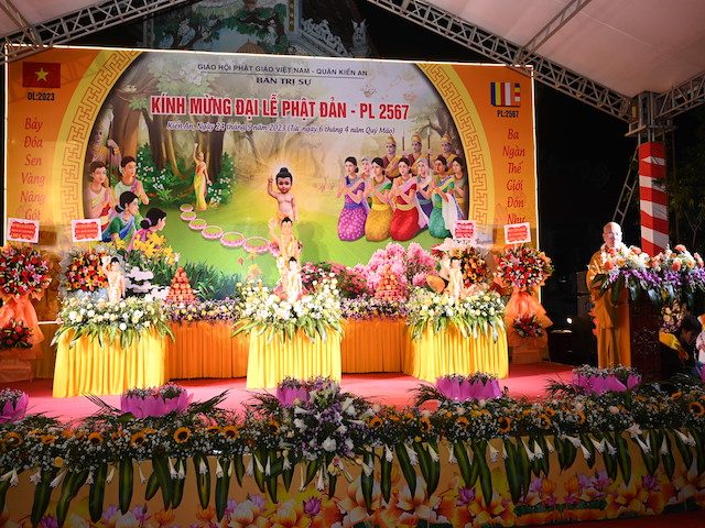 Sau nghi thức niệm Phật cầu gia bị, chào Quốc kỳ, Đạo kỳ, HT. Thích Quảng Tùng – Phó Chủ tịch HĐTS TƯ GHPGVN, trưởng Ban trị sự GHPGVN thành phố Hải Phòng đã lên cung tuyên Thông điệp Phật đản PL.2567 – DL.2023 của Đại lão Hòa thượng Thích Trí Quảng – Đức Đệ tứ Pháp chủ GHPGVN, bức Thông điệp nêu rõ: