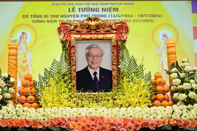 Trong niềm xúc động, tiếc thương sâu sắc, Để tỏ lòng thành kính, tri ân và lòng biết ơn vô hạn đối với Tổng Bí thư Nguyễn Phú Trọng, một nhà lãnh đạo mẫu mực, một nhà tư tưởng, nhà văn hóa kiệt xuất của Đất nước, dành trọn cả cuộc đời cho Đất nước, cho nhân dân. Ban trị sự GHPGVN thành phố Hải Phòng, chư tôn đức Tăng Ni đang thực hiện cấm túc an cư tại trường hạ cơ sở 1, đồng bào Phật tử và nhân dân thành phố đã trang nghiêm thành kính tổ chức lễ dâng hương tưởng niệm, tụng kinh cầu siêu, cầu nguyện cho hương linh của cố Tổng Bí thư được sinh về cảnh giới an lành.
