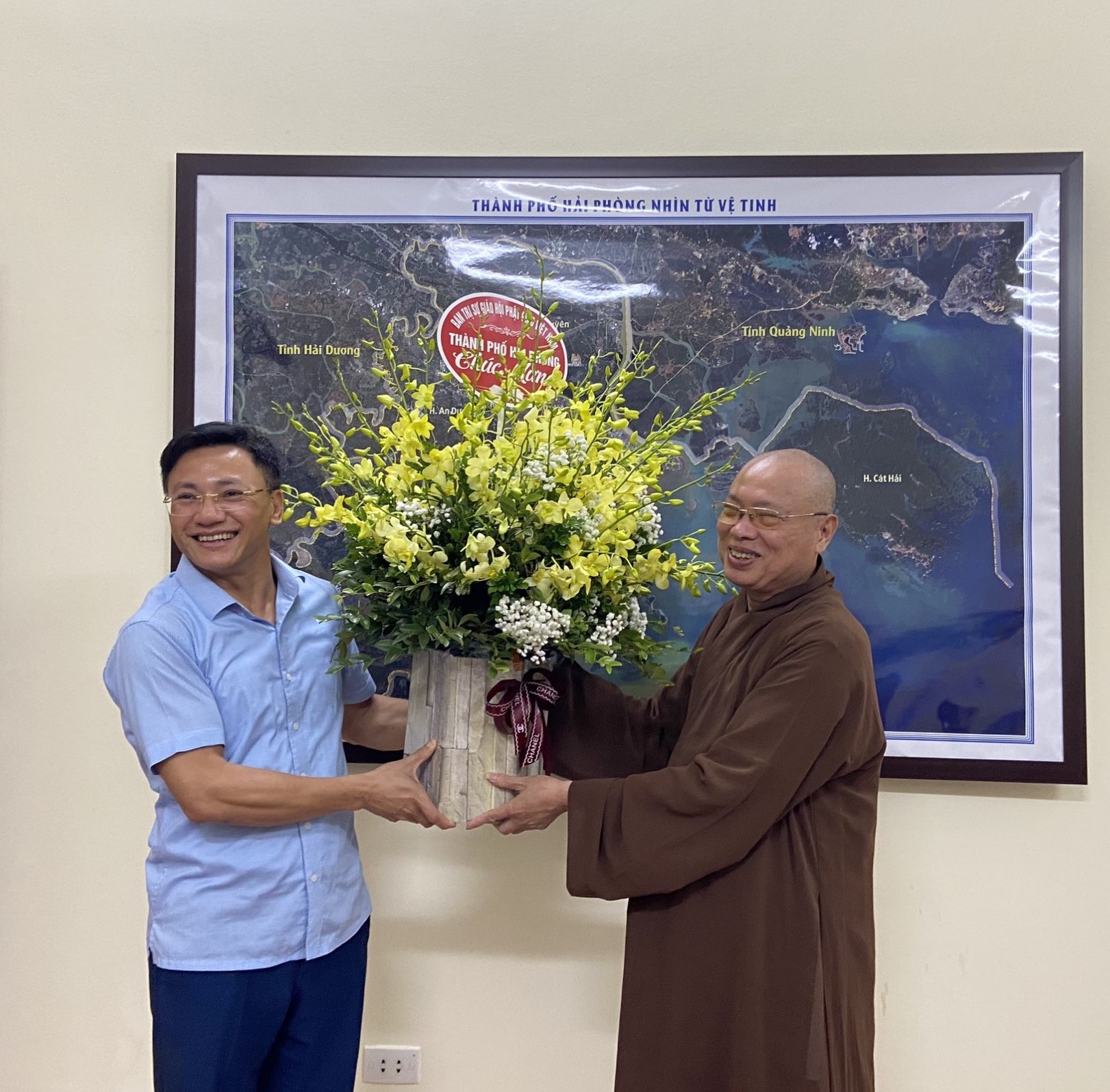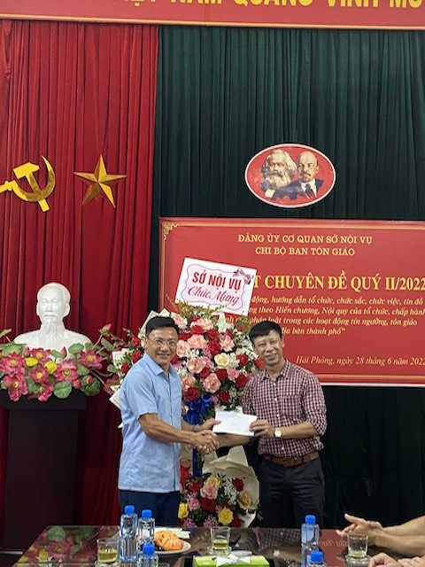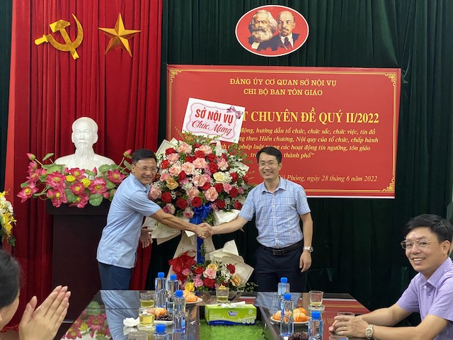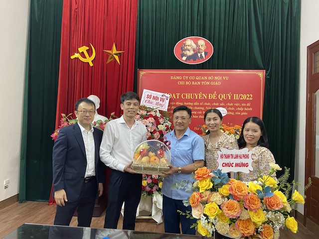 Phái đoàn BTS GHPGVN TP. Hải Phòng tặng hoa chúc mừng Ban Tôn giáo thành phố nhân kỷ niệm 67 năm ngày truyền thống Ngành quản lý Nhà nước về Tôn giáo (2/8/1955-2/8/2022).Tiếp đoàn tại trụ sở Ban Tôn giáo thành phố có ông Dương Ngọc Anh – Trưởng Ban Tôn giáo, Sở nội vụ TP.Hải Phòng cùng đại diện chuyên viên, cán bộ đang công tác tại Ban Tôn giáo thành phố.