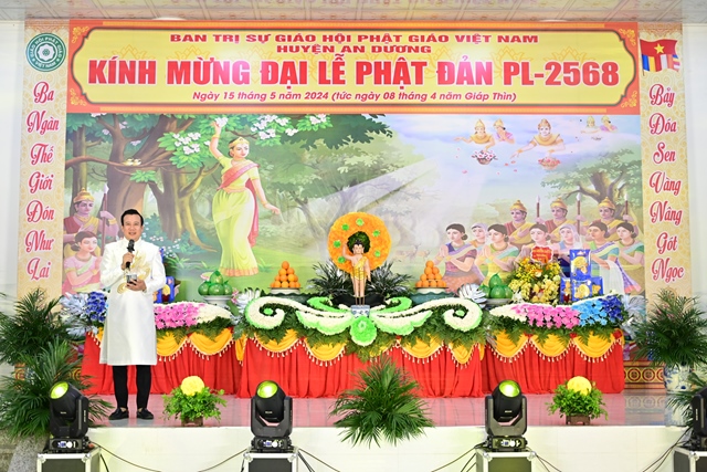 Mở đầu buổi lễ là những tiết mục văn nghệ đặc sắc do các văn nghệ sỹ, ca sỹ đoàn Chèo và đoàn Cải lương thành phố Hải Phòng cúng dàng lên đức Bản Sư Thích Ca Mâu Ni Phật nhân sự kiện đản sinh Tiếp đó, Hòa thượng Thích Thanh Giác đã lên cung tuyên thông điệp Phật đản PL. 2568 của đức Đại lão Hòa thượng đệ tứ Pháp Chủ GHPGVN, Hòa thượng Thích Trí Quảng gửi Tăng Ni, Phật tử trong nước và ở nước ngoài. Toàn thể đại chúng đã khởi thân đứng dậy, trang nghiêm thành kính lắng nghe bức thông điệp Phật đản đầy ý nghĩa. Bức thông điệp có đoạn: “ Mùa Phật đản, mùa của yêu thương và hiểu biết, tôi kêu gọi tất cả những người con Phật hãy tinh tấn thực hành những lời dạy vàng ngọc của đức Phật; tịnh hóa tâm thức; chuyển hóa tam độc tham, sân, si thành tam vô lậu học giới, định, tuệ; kiến tạo chánh báo trang nghiêm thanh tịnh để hình thành y báo hòa bình, an lạc như kinh Duy Ma Cật đã dạy: “Tâm bình thế giới bình”.”