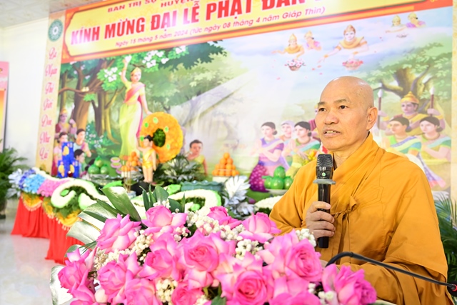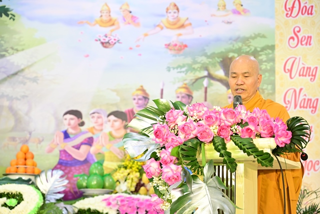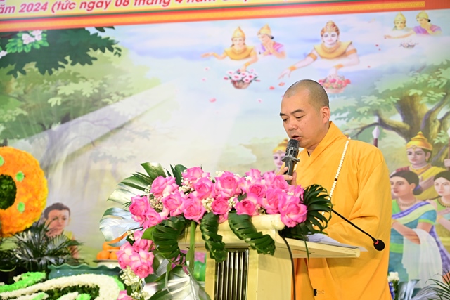 Tiếp đó, Đại đức Thích Giác Huy đã lên tuyên đọc Diễn văn Phật đản PL. 2568 – DL. 2024 của đức Trưởng lão Hòa thượng Thích Thiện Nhơn – Phó Pháp chủ HĐCM, Chủ tịch HĐTS TƯ GHPGVN gửi chư tôn đức tăng ni và Phật tử nhân đại lễ Phật đản năm nay. Trong bài diễn văn, trưởng lão Hòa thượng Chủ tịch HĐTS đã nhắc nhở “ Tăng Ni phải đề cao trách nhiệm, giữ vững kỷ cương, và làm tròn bổn phận của mình góp phần xiển dương chánh pháp, bảo vệ niềm tin, tỏa sáng đạo màu đến khắp nhân gian. Các cấp Giáo hội tập trung tổ chức tốt kỳ an cư kết hạ Phật lịch 2568 nêu cao tính kỷ cương, trách nhiệm, hành trì giới luật để trang nghiêm Giáo hội ngõ hầu báo đáp, tri ân công đức sâu dày của Chư vị Tổ sư tiền bối. Tăng Ni các chùa, cơ sở tự viện đổi mới sáng tạo trong phương thức hướng dẫn tín đồ Phật tử phù hợp với mọi tầng lớp trong xã hội, góp phần chăm sóc sức khỏe tinh thần, xây dựng và làm đẹp nền đạo đức xã hội thông qua việc tổ chức các Khóa tu Mùa hè cho thanh thiếu niên Phật tử hè 2024 giúp cho các bạn trẻ trở thành những con ngoan, trò giỏi, học tập tiến bộ. Giáo dục lòng yêu nước, tự hào truyền thống anh hùng của dân tộc Việt Nam; Phát huy tinh thần đại đoàn kết dân tộc chung tay xây dựng quê hương, đất nước Việt Nam hùng cường, thịnh vượng. Thiện hữu nam nữ Phật tử làm người công dân tốt. Gắng sức tu tập, luôn tinh tấn trau dồi đức hạnh, dứt bỏ tham, sân, si, thói quen mê lầm, phiền não nỗ lực tu tâm dưỡng tính để thân tâm được an lạc, thanh tịnh, được hưởng hạnh phúc nơi cuộc đời và bước lên con đường giải thoát trong tương lai.”