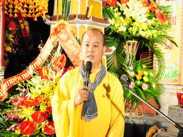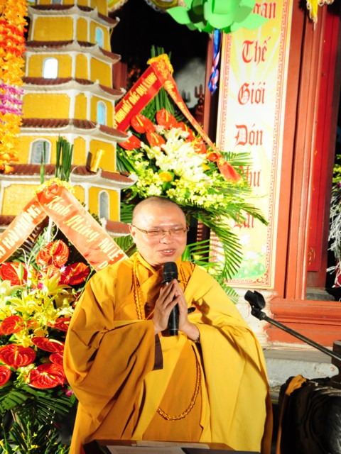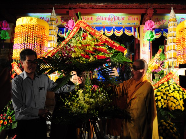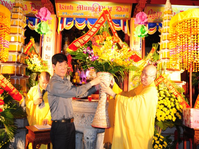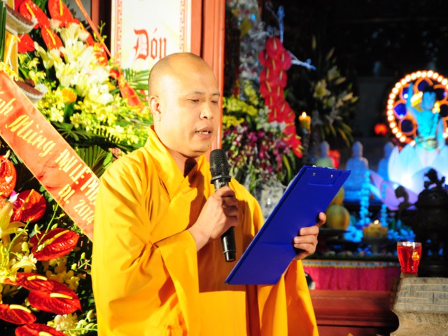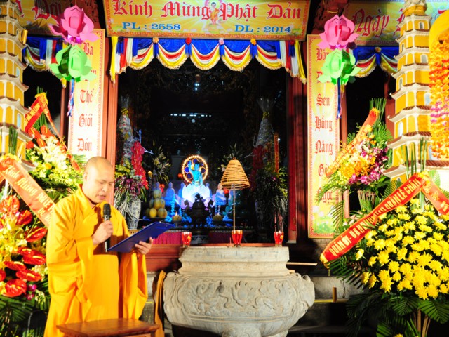 Sau nghi thức chào Quốc kỳ, Đạo kỳ, 1 phút nhập từ bi quán, TT. Thích Thanh Giác – Phó Ban Hoằng Pháp TW GHPGVN, Phó trưởng Ban trị sự GHPGVN Tp. Hải Phòng đã lên cung tuyên Thông điệp mừng Phật đản PL. 2558 của đức Pháp chủ GHPGVN, Hòa thượng thượng Phổ hạ Tuệ.