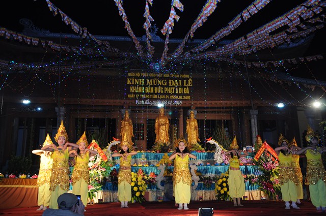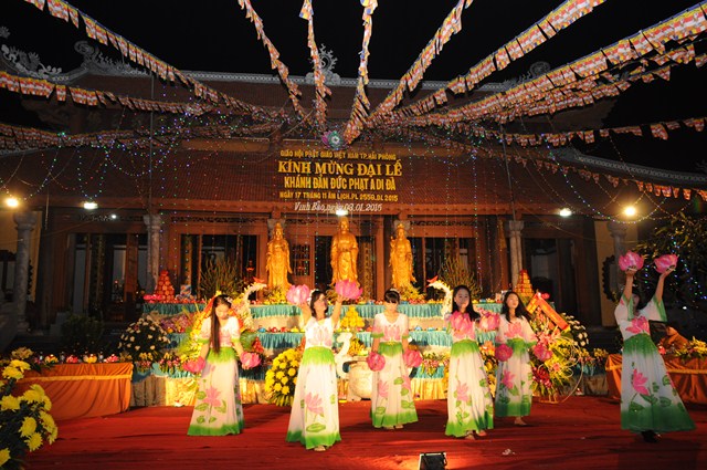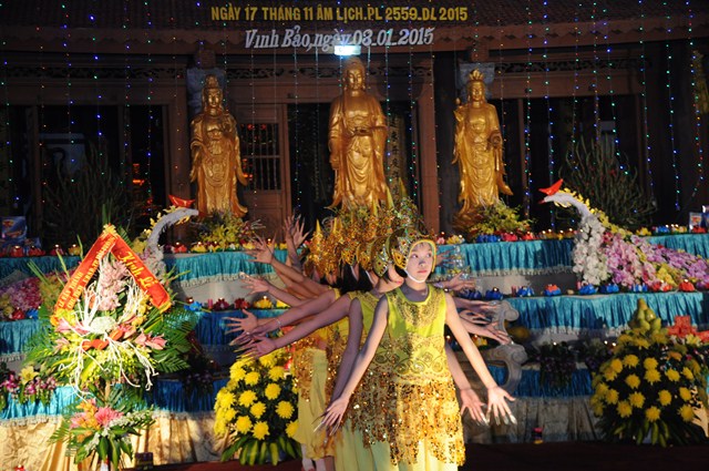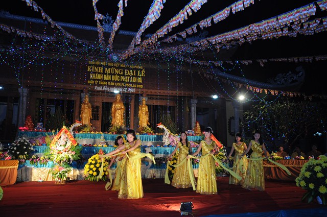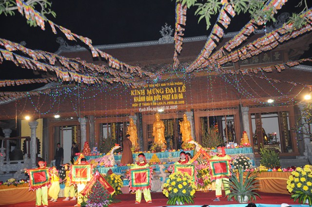 Mở đầu chương trình đêm Hội hoa đăng kỷ niệm khánh đản Đức Phật A Di Đà là các tiết mục văn nghệ do các em thanh thiếu niên Phật tử trường cấp 1 và cấp 2 thị trấn Vĩnh Bảo trình bày.