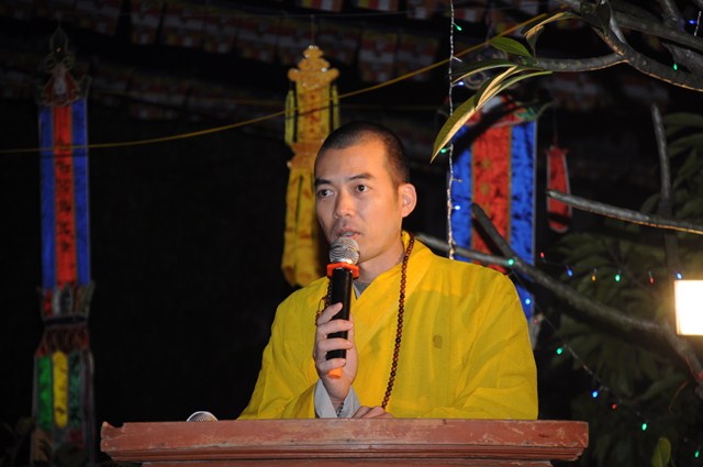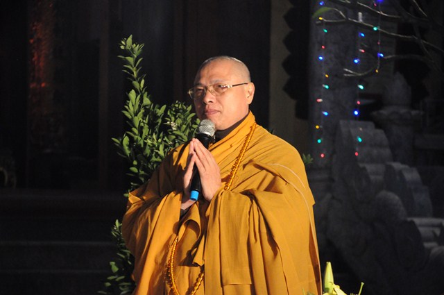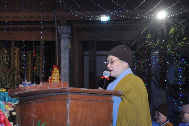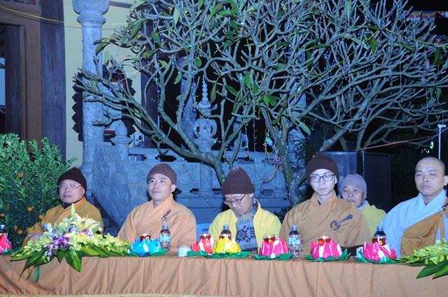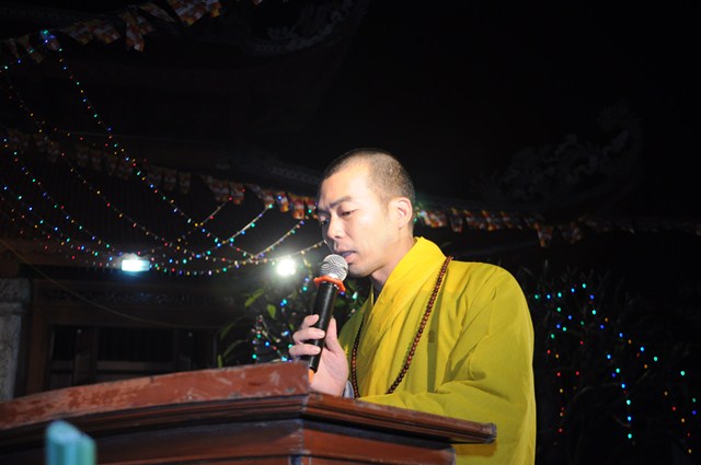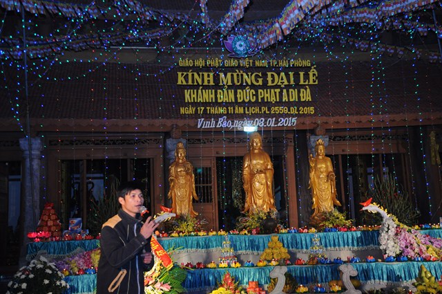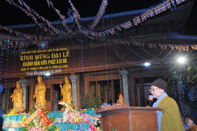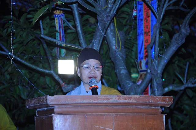 Sau nghi thức niệm Phật cầu gia hộ, một phút nhập từ bi quán tưởng niệm chư tôn đức hữu công của GHPGVN, tưởng niệm các anh hùng liệt sỹ đã hy sinh cho độc lập chủ quyền của Đất nước, Ni Sư Thích Đàm Tân – Phó trưởng Ban TT Ban trị sự GHPGVN huyện Vĩnh Bảo đã lên tuyên đọc Diễn văn khai mạc Đêm hoa đăng kính mừng Khánh đản Đức Phật A Di Đà PL.2558, DL.2015.
