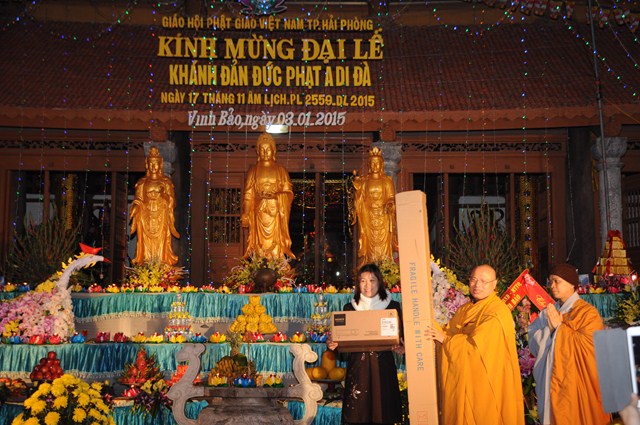 Nhân dịp này, Ban trị sự GHPGVN huyện Vĩnh Bảo đã trao tặng trường tiểu học thị trấn 1 bộ đèn, máy chiếu trị giá 16 triệu đồng, nói lên sự quan tâm của Phật giáo đến thế hệ tương lai của Đất nước trên phương châm: “Phật giáo luôn đồng hành cùng Dân tộc”.