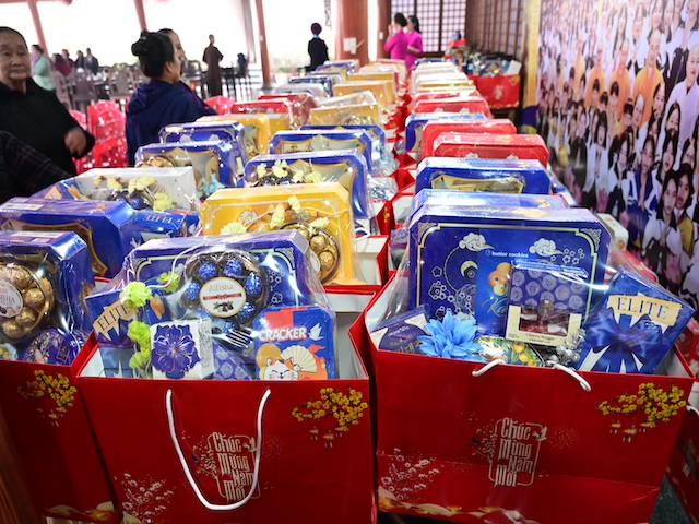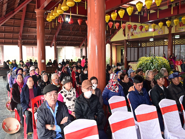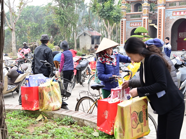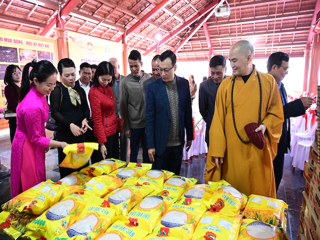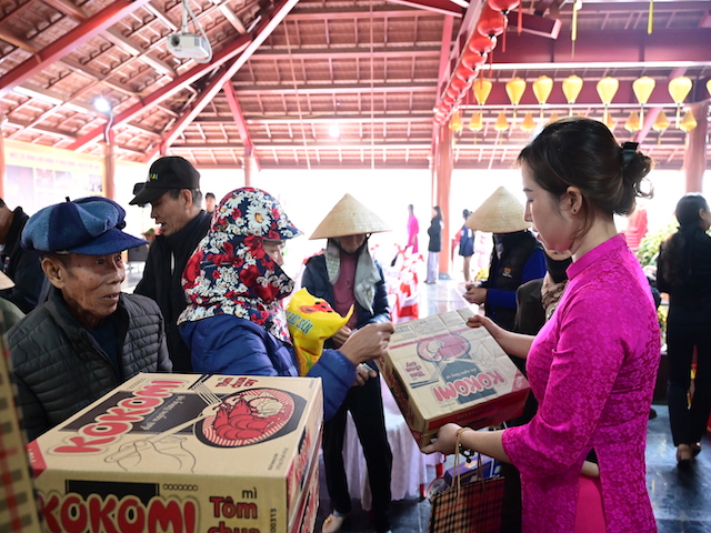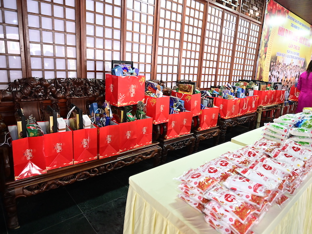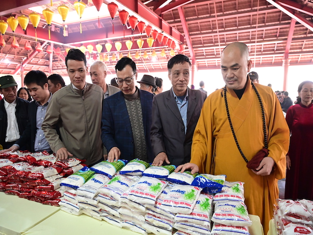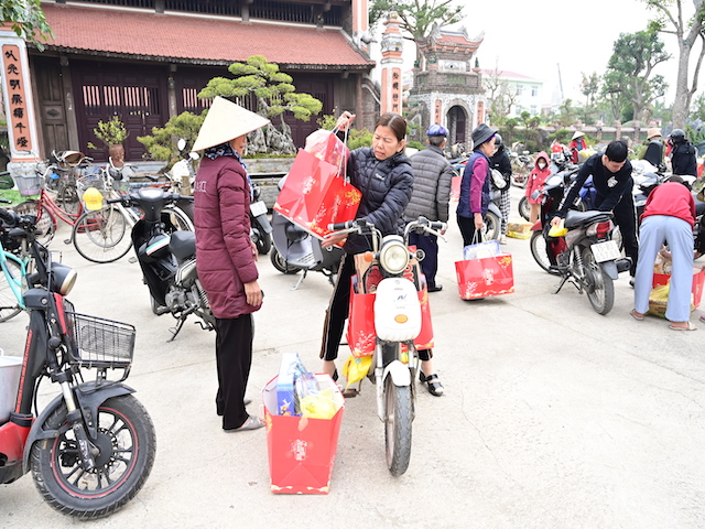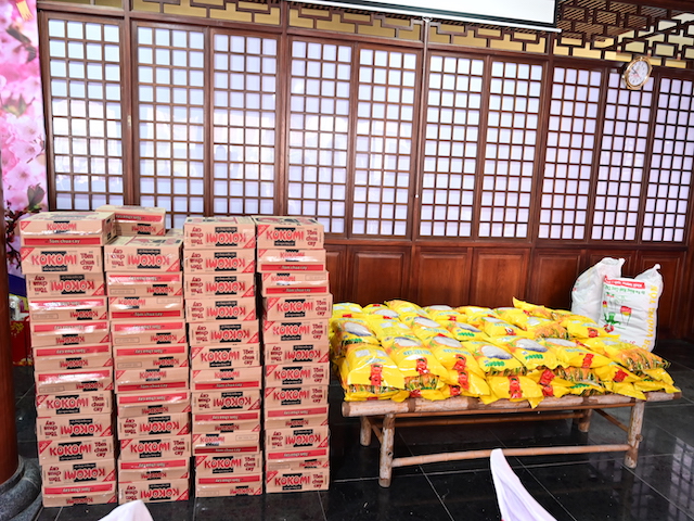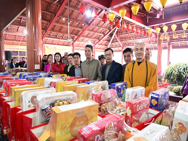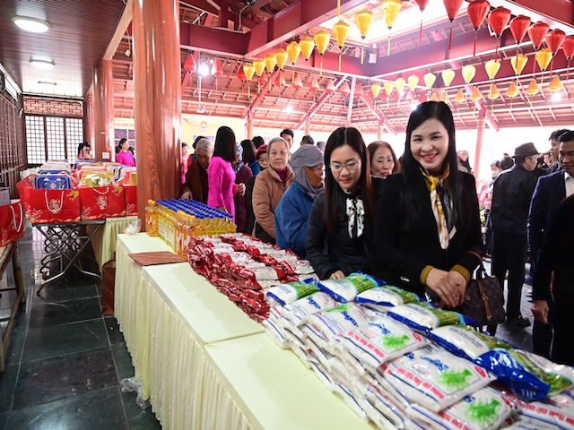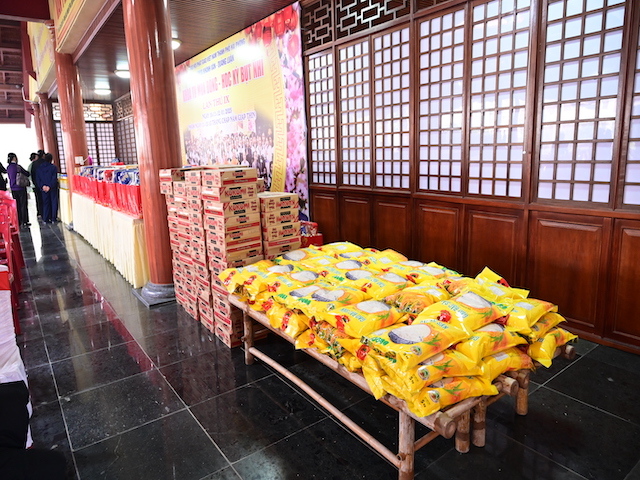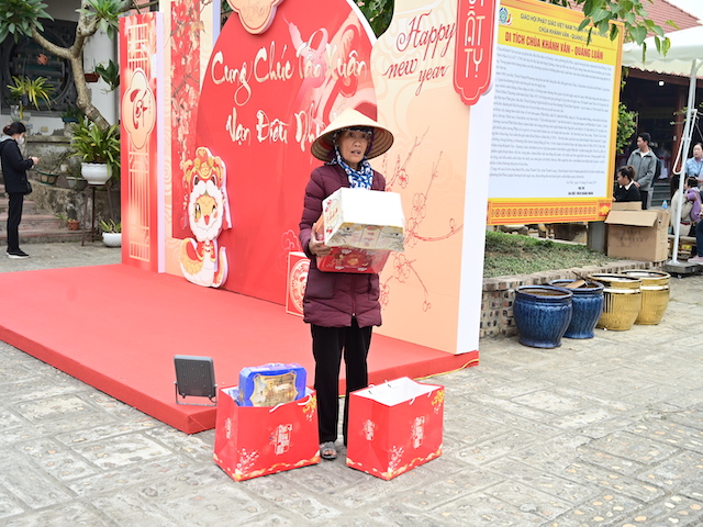 Ngay sau buổi lễ khai mạc, bà con nhân dân có hoàn cảnh khó khăn, học sinh nghèo vượt khó đã đổi phiếu nhận quà và đến các gian hàng trực tiếp nhận quà, với những mặt hàng lương thực, thực phẩm, nhu yếu phẩm cần thiết, thiết thực phục vụ tết như: Gạo, bột ngọt, đường, dầu ăn, bột canh, mì tôm, nước tương, bánh kẹo, Sô cô la…Các gian hàng được ban tổ chức sắp xếp rất gọn gàng, ngăn nắp, mỗi gian hàng đều bố trí thanh thiếu niên Phật tử cùa chùa hướng dẫn bà con nhận hàng miễn phí. Được biết, Ban tổ chức đã chuẩn bị tổng số 130 phần quà, mỗi phần quà có giá trị 1 triệu đồng. Với tổng số tiền hơn 130 triệu đồng. Bà con ai cũng hân hoan, phấn khởi khi được nhận những món quà tết rất ý nghĩa từ ban tổ chức và hy vọng một mùa xuân mới bình an và hạnh phúc.