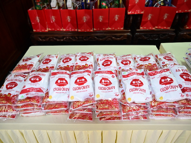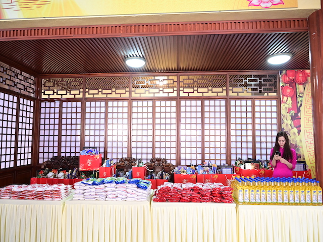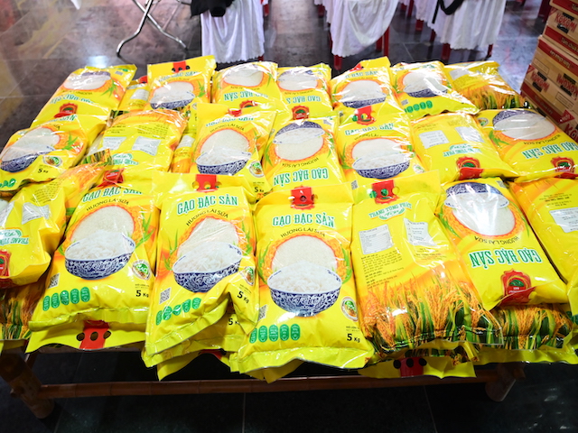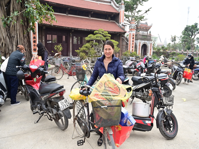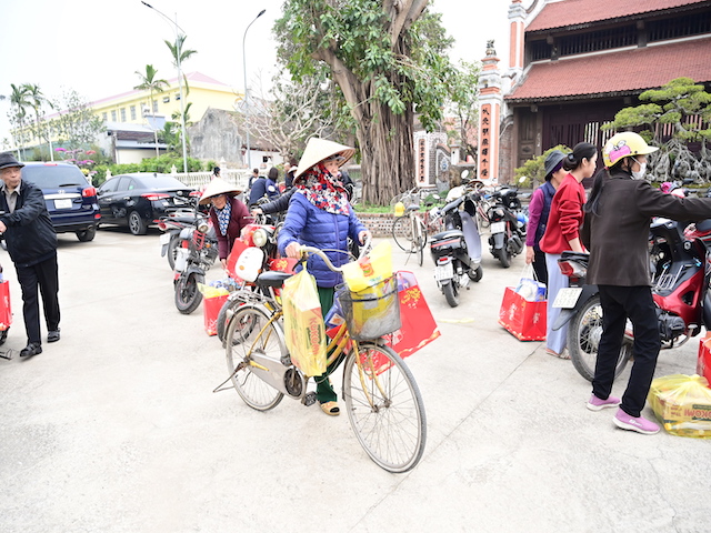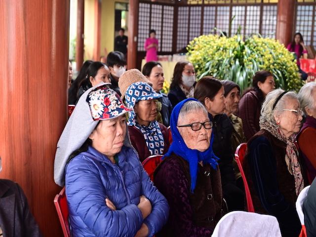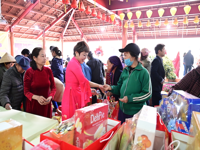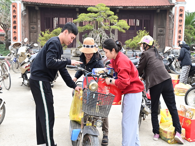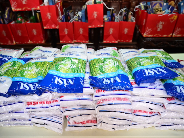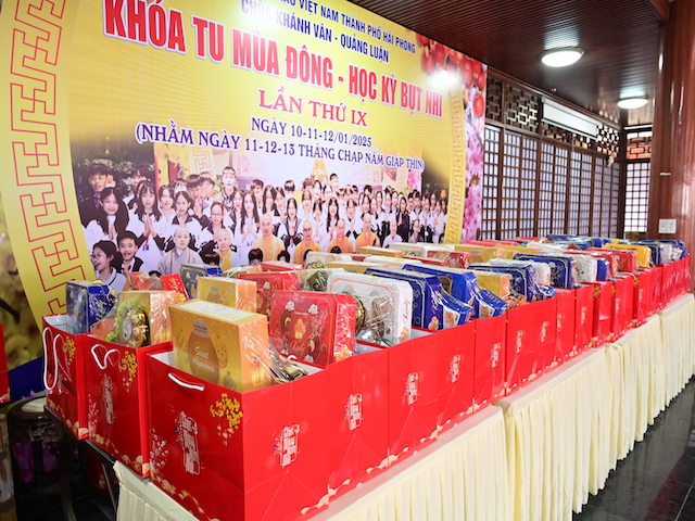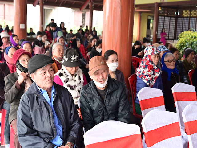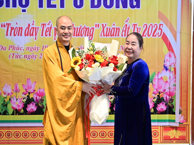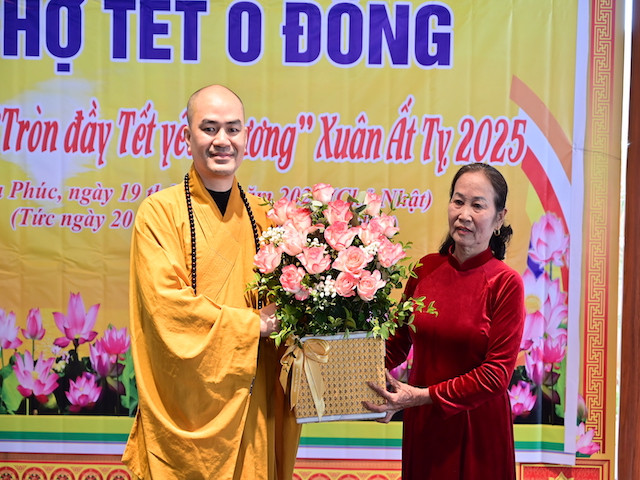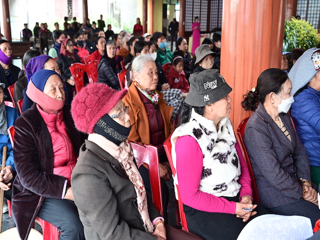 Ngay sau buổi lễ khai mạc, bà con nhân dân có hoàn cảnh khó khăn, học sinh nghèo vượt khó đã đổi phiếu nhận quà và đến các gian hàng trực tiếp nhận quà, với những mặt hàng lương thực, thực phẩm, nhu yếu phẩm cần thiết, thiết thực phục vụ tết như: Gạo, bột ngọt, đường, dầu ăn, bột canh, mì tôm, nước tương, bánh kẹo, Sô cô la…Các gian hàng được ban tổ chức sắp xếp rất gọn gàng, ngăn nắp, mỗi gian hàng đều bố trí thanh thiếu niên Phật tử cùa chùa hướng dẫn bà con nhận hàng miễn phí. Được biết, Ban tổ chức đã chuẩn bị tổng số 130 phần quà, mỗi phần quà có giá trị 1 triệu đồng. Với tổng số tiền hơn 130 triệu đồng. Bà con ai cũng hân hoan, phấn khởi khi được nhận những món quà tết rất ý nghĩa từ ban tổ chức và hy vọng một mùa xuân mới bình an và hạnh phúc.