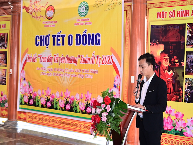 Tiếp đó, Thay mặt cho lãnh đạo phường Đa Phúc, ông: Phạm Văn Phúc – Chủ tịch UB MTTQVN phường đã có bài phát biểu bày tỏ lòng biết ơn sâu sắc đến các tổ chức, cá nhân, các nhà hảo tâm, các mạnh thường quân, các Phật tử. Đặc biệt có lời tri ân tới Đại đức Thích Quảng Nghĩa – Trụ trì chùa Khánh Vân đã luôn đồng hành cùng địa phương trong các công tác đảm bảo an sinh xã hội. Sự đồng hành của nhà chùa không chỉ thể hiện tinh thần “ Phật giáo luôn đồng hành cùng Dân tộc” mà còn làm đẹp thêm truyền thống nhân văn, lá lành đùm là rách của dân tộc ta từ ngàn đời nay. Ông kính chúc chư tôn đức Tăng Ni, đại đức trụ trì chùa Khánh Vân, các nhà hảo tâm, các mạnh thường quân, bà con nhân dân, Phật tử đón xuân mới vô lượng an lạc, vô lượng cát tường, tràn đầy hạnh phúc.