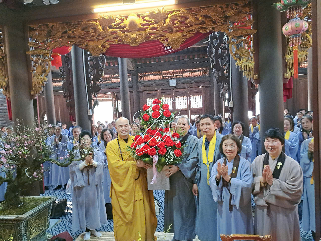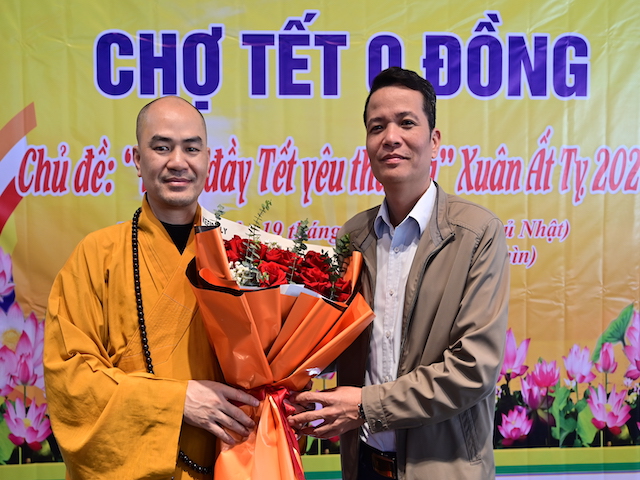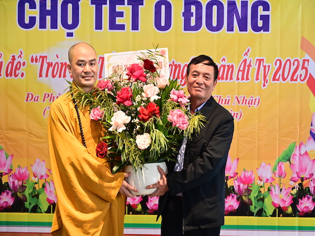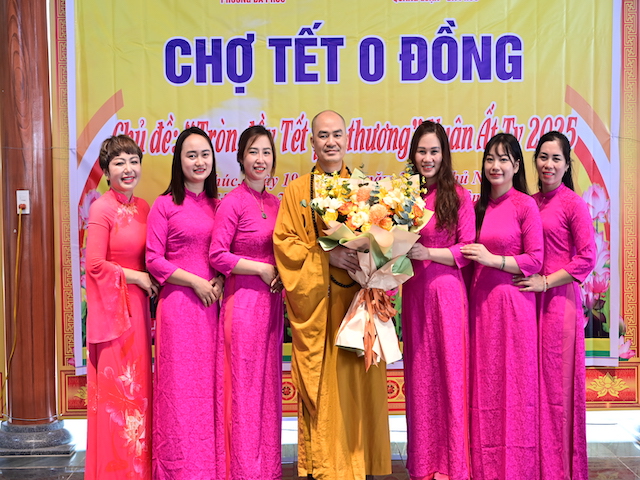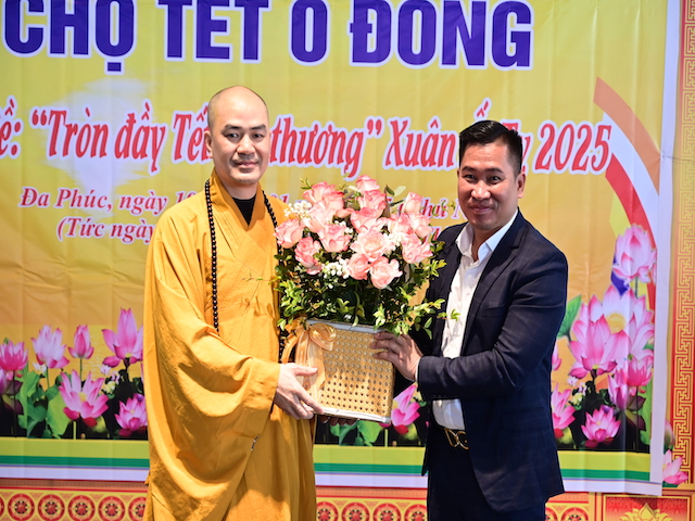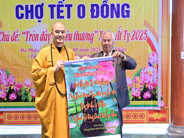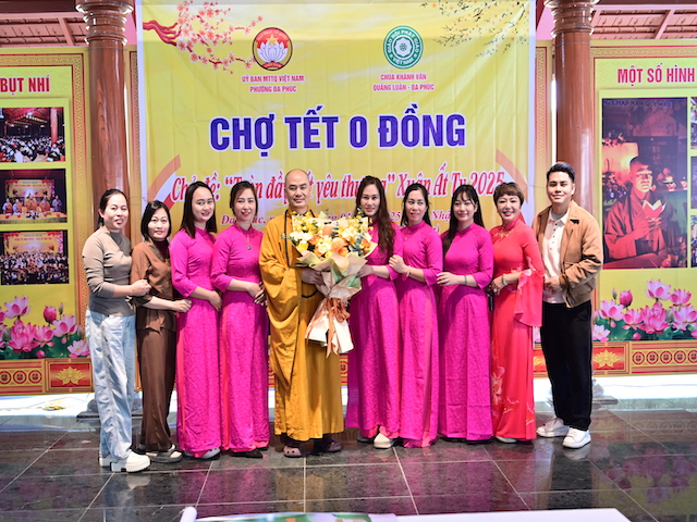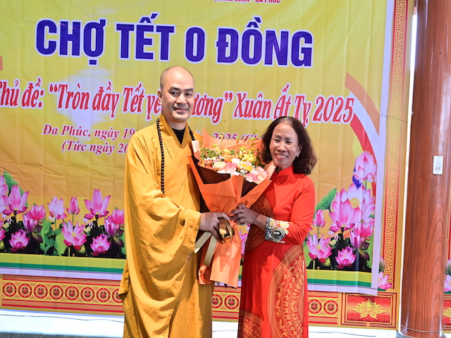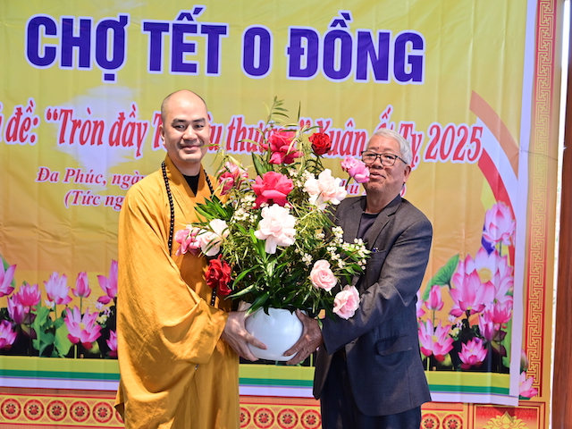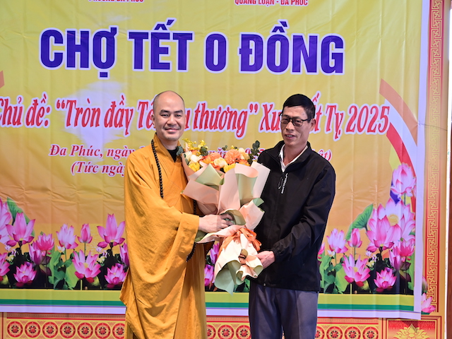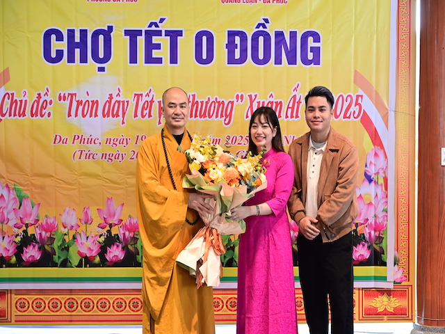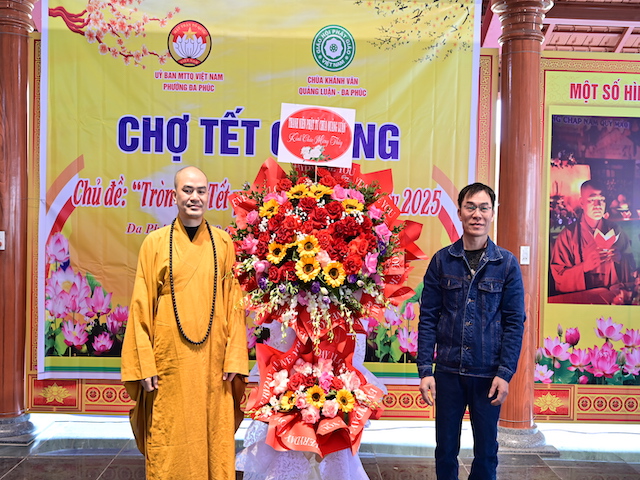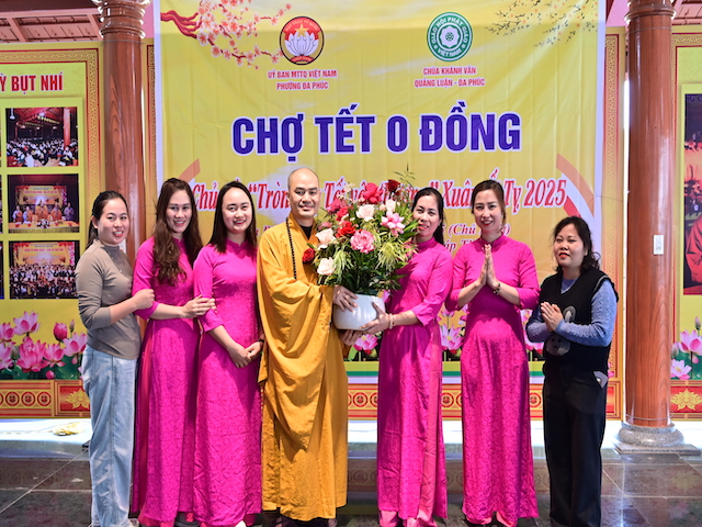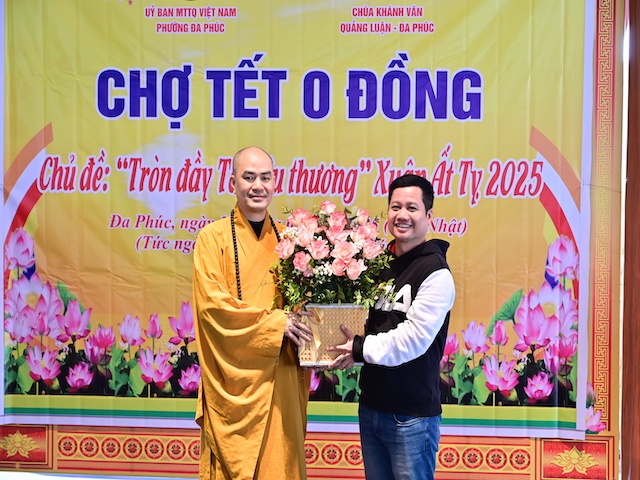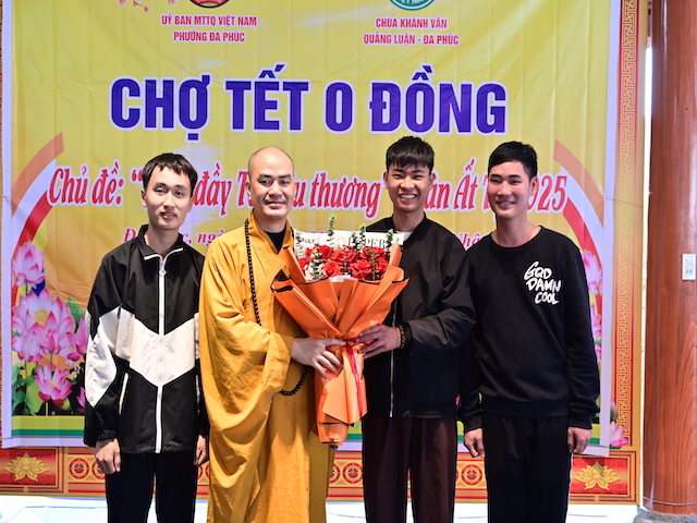 Ngay sau khi kết thúc phiên chợ tết 0 đồng, lãnh đạo phường Đa Phúc, các bô lão trong phường, các Phật tử chùa Khánh Vân ( Quảng Luận), chùa Hải Thành ( quận Dương Kinh), CLB TTNPT chùa Khánh Vân, các đạo tràng Phật tử trong quận đã có những lẵng hoa tươi thắm, những phần quà chúc mừng Đại đức Thích Quảng Nghĩa vừa bảo vệ thành công Luận án Tiến sĩ, chuyên ngành Tôn giáo học, Mã số 9229009 tại Học viện Khoa học xã hội – Viện Hàn Lâm Khoa Khoa học xã hội Việt Nam ( quận Thanh Xuân, Hà Nội), với đề tài: “ Sơn môn Tế Xuyên – Bảo Khám ở Việt Nam: Lịch sử, hiện trạng và vấn đề đặt ra.” Luận án đã được Hội đồng khoa học đánh giá kết quả xuất sắc.